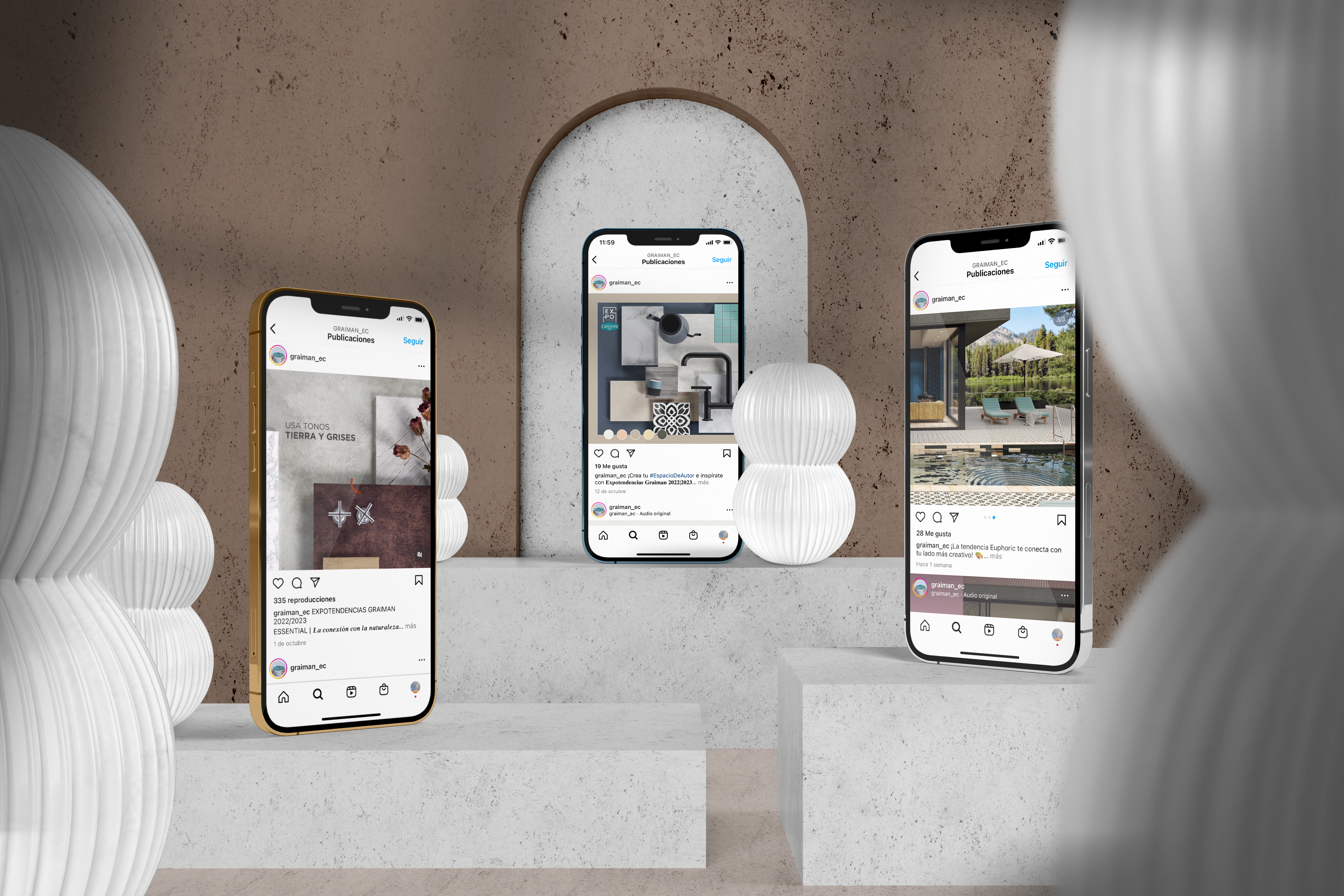 La primera acción fue desarrollar el estudio de tendencias decorativas 2022. Detectamos 4 tendencias que desarrollamos a nivel cromático y sus características decorativas, inspiraciones, etc. Estas 4 tendencias las trasladamos a la selección de producto GRAIMAN: nos encargamos de seleccionar y agrupar el producto cerámico para cada una de ellas.