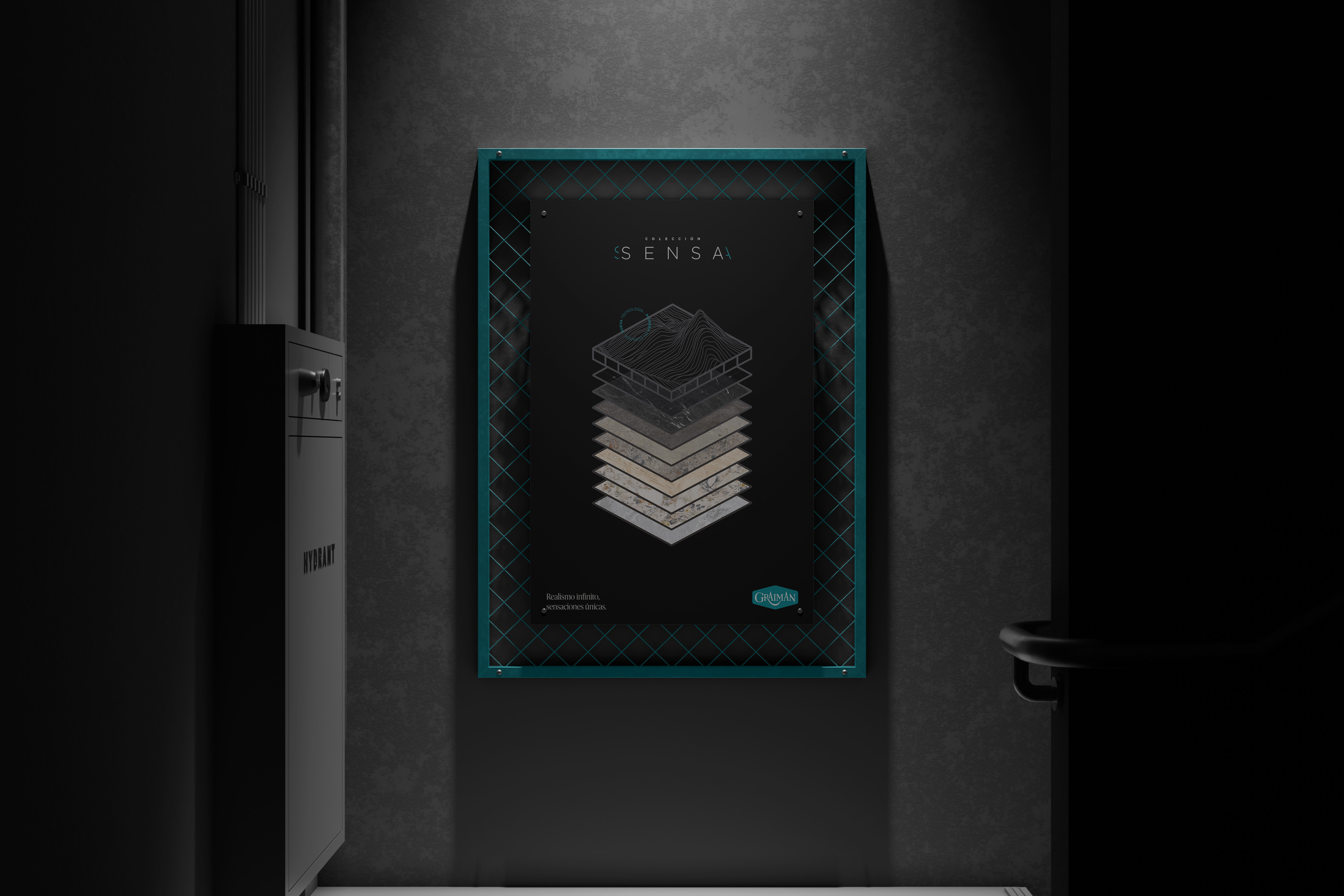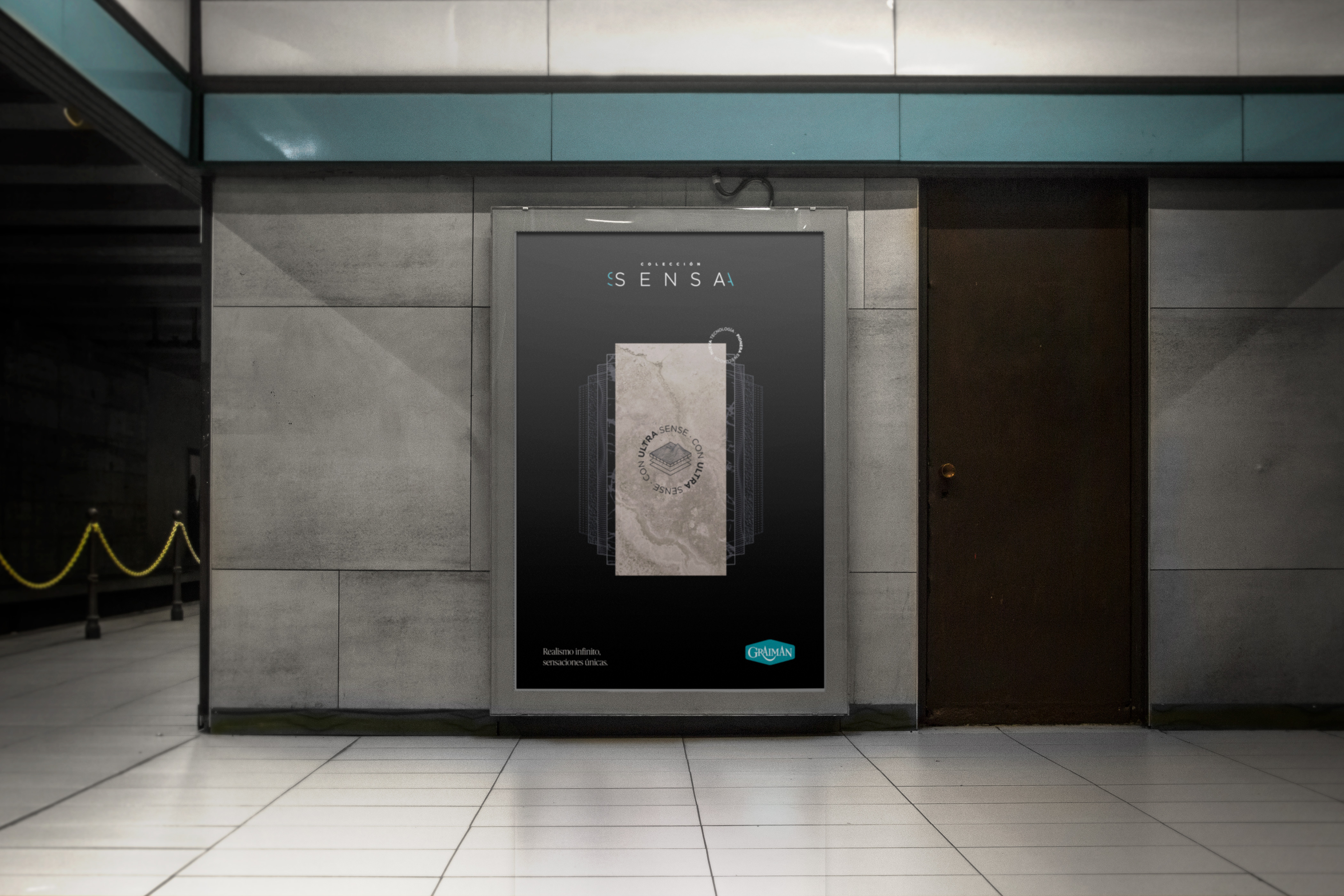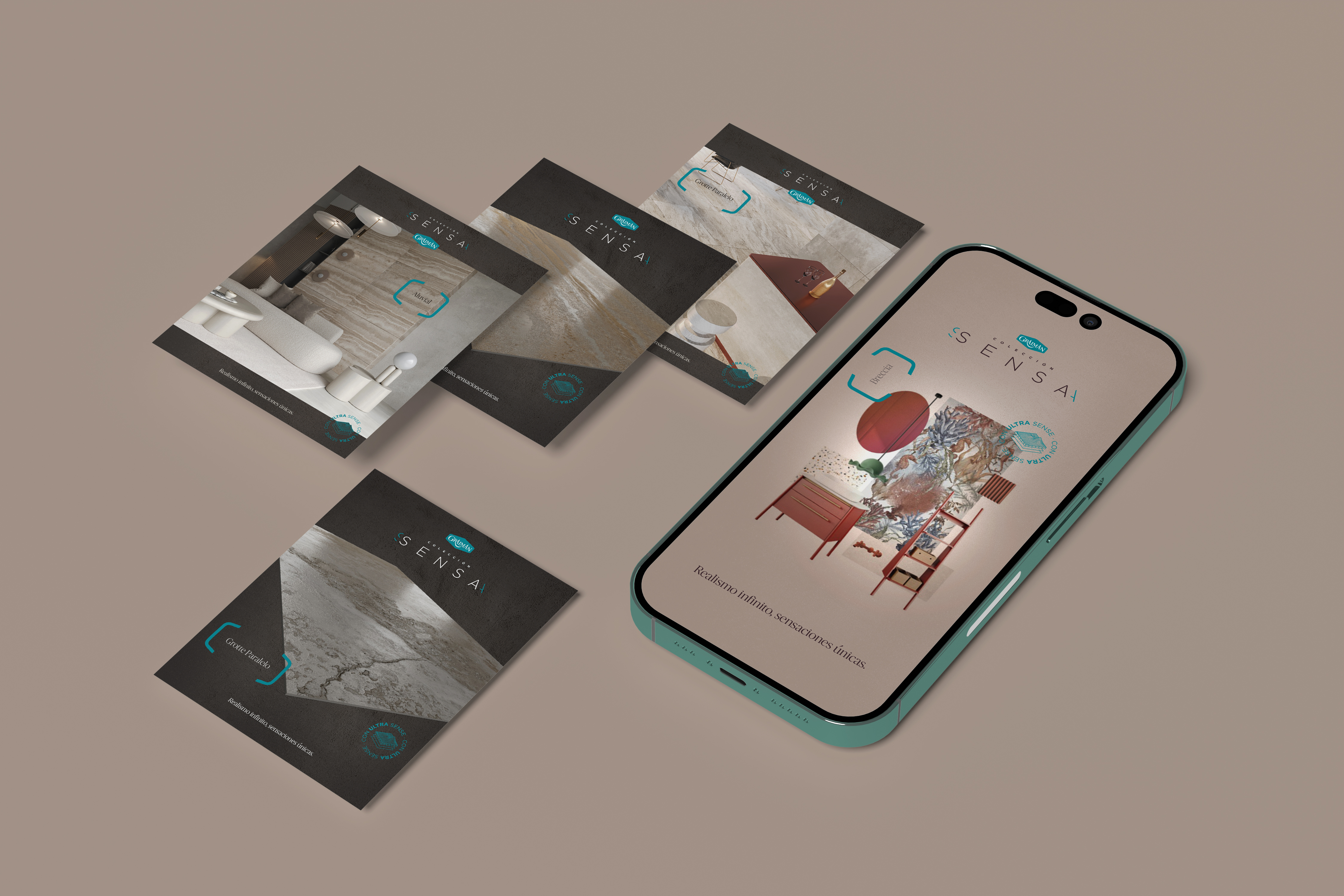 Based on the name SENSA — a word that evokes sensory activation and perception — we created a complete visual narrative. The claim “Infinite realism, unique sensations” became the thread connecting all elements of the concept. It sums up the impact of the technology: a product that not only looks real, but also feels real. From this premise, we developed the entire graphic universe of the collection, where ceramic surfaces appear alive — reflecting light, generating contrast and transmitting texture.