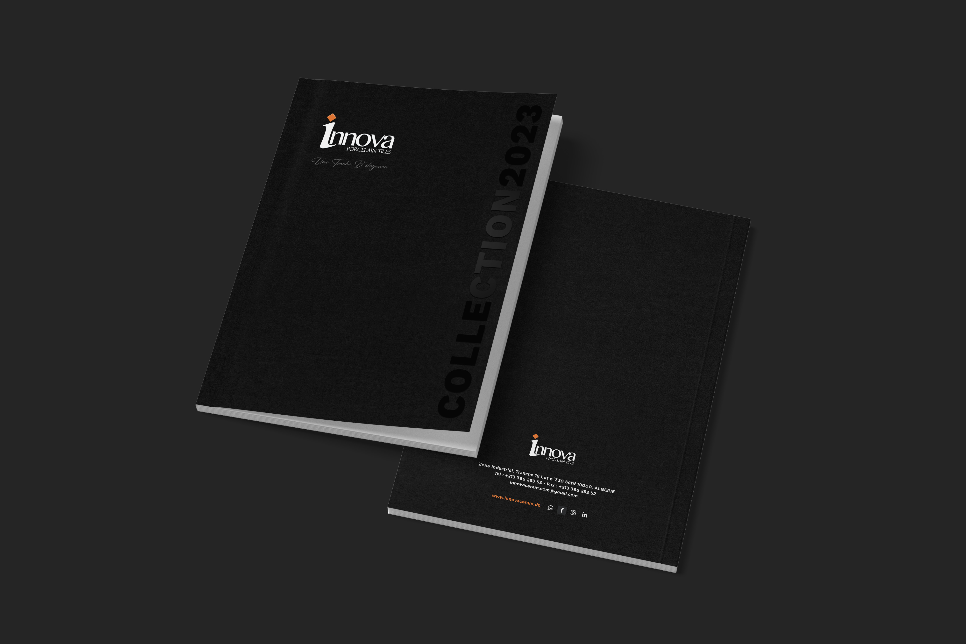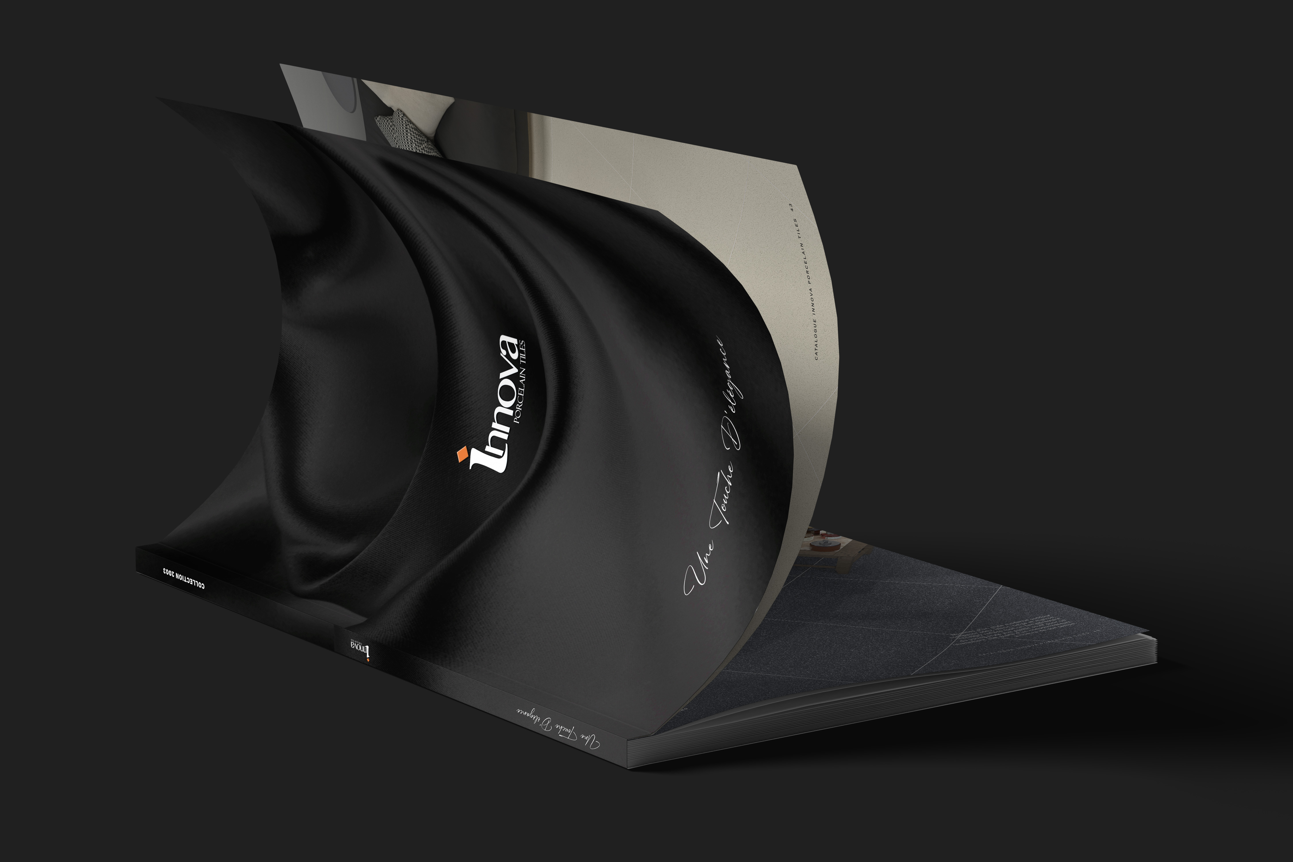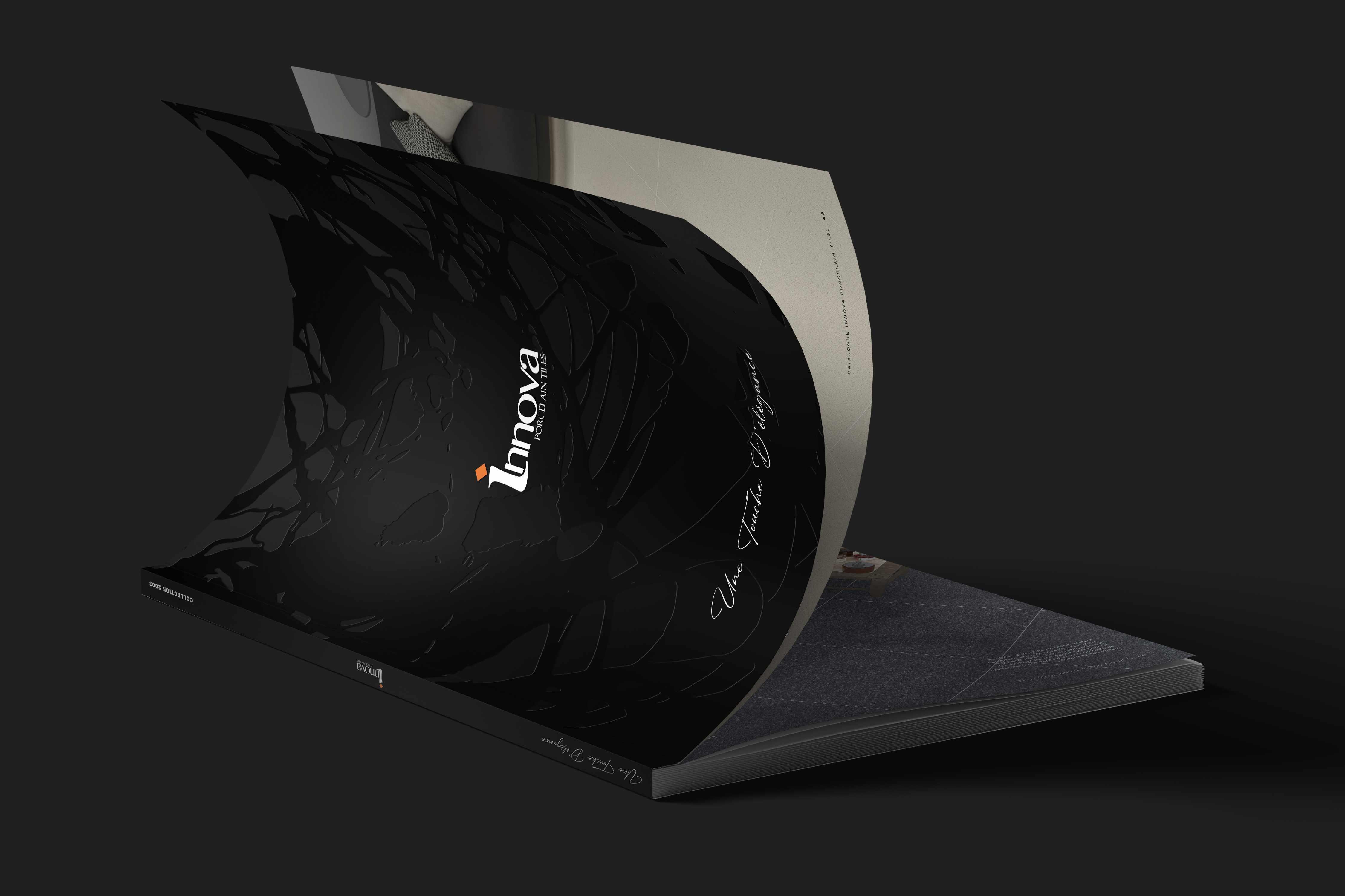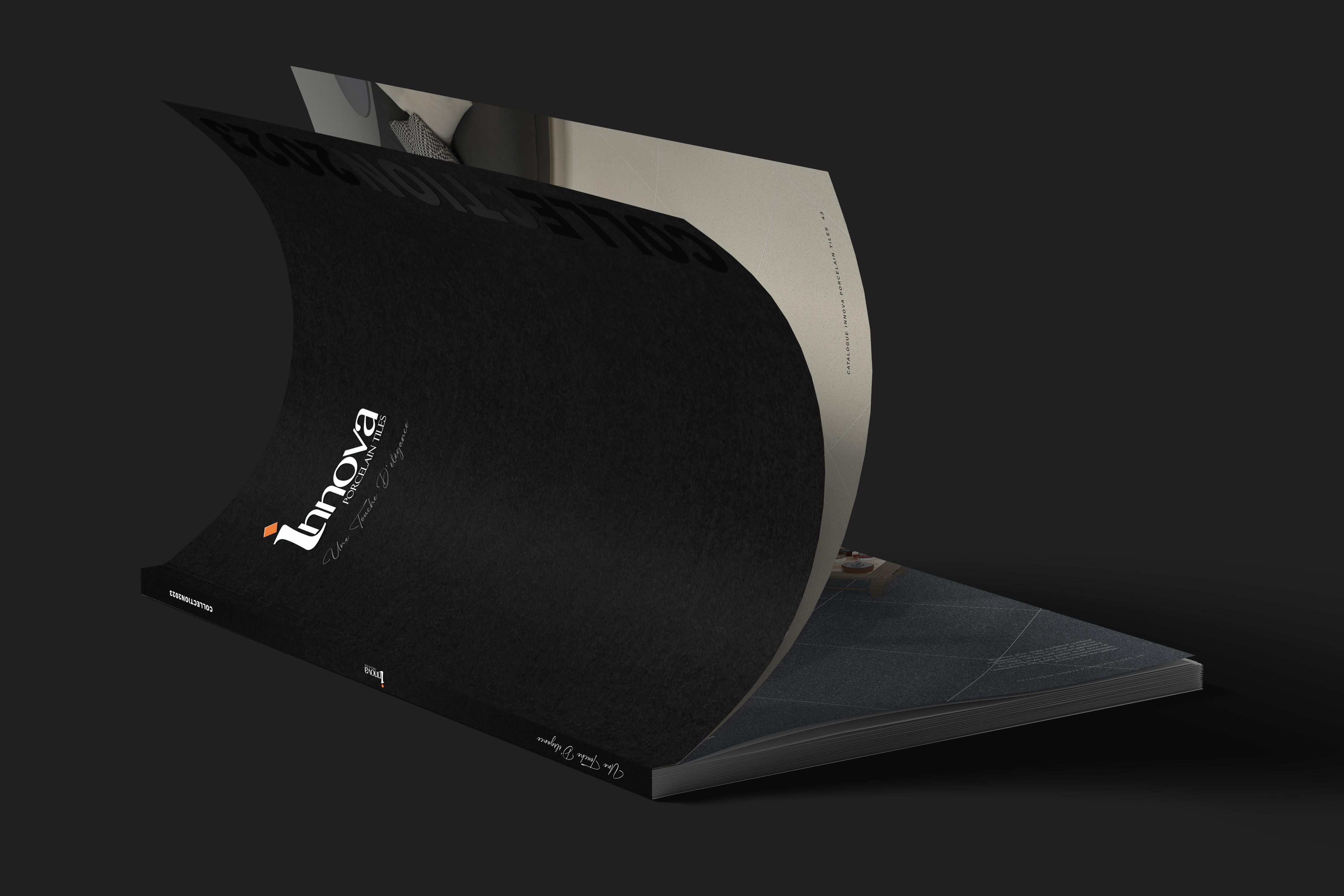 Logotipo de INNOVA en relieve y en brillo. El fondo es negro impreso sobre un papel con textura, con un acabado natural. A la derecha va el texto COLLECTION2023 sin color, solo con una reserva UVI con acabado brillo.