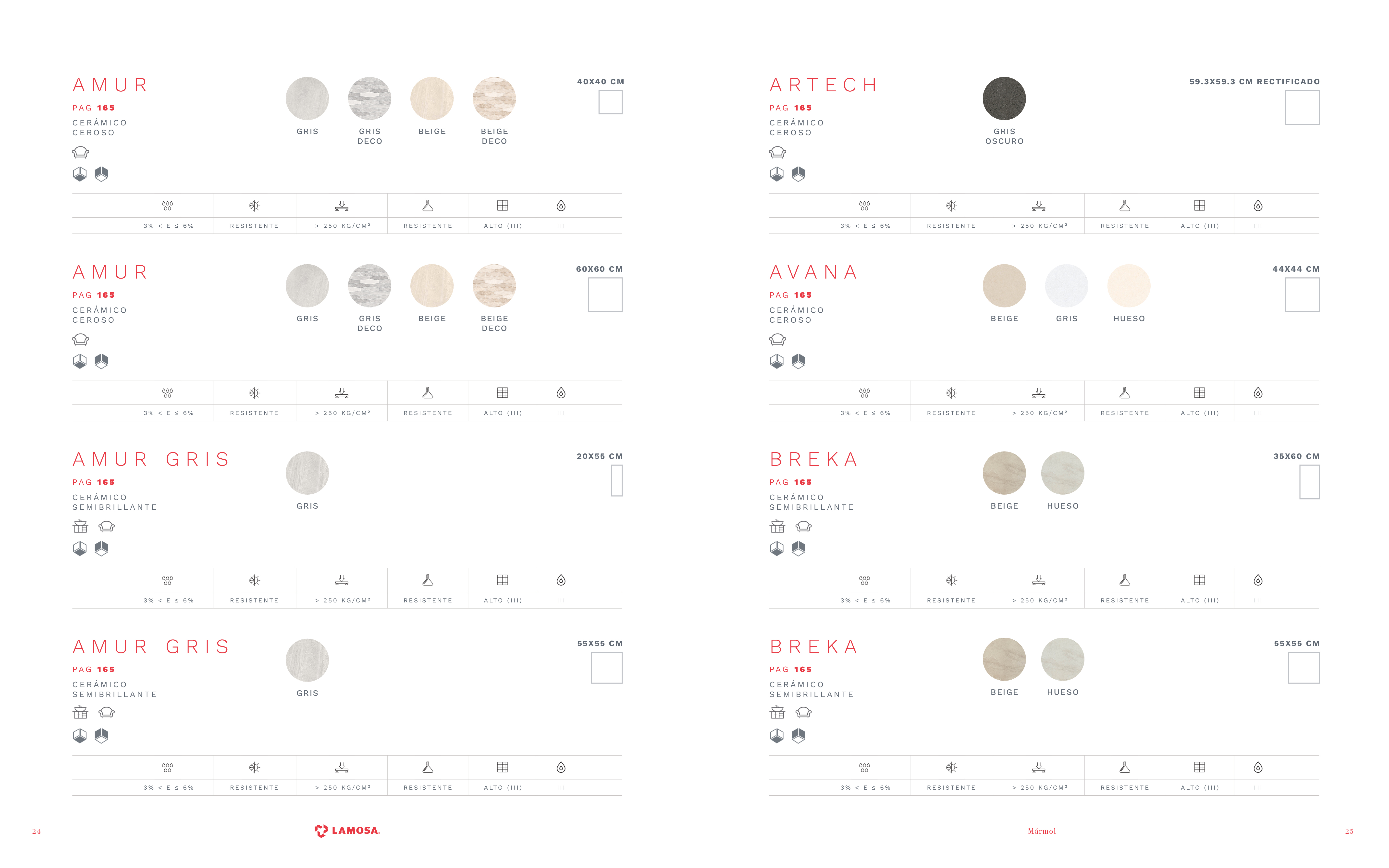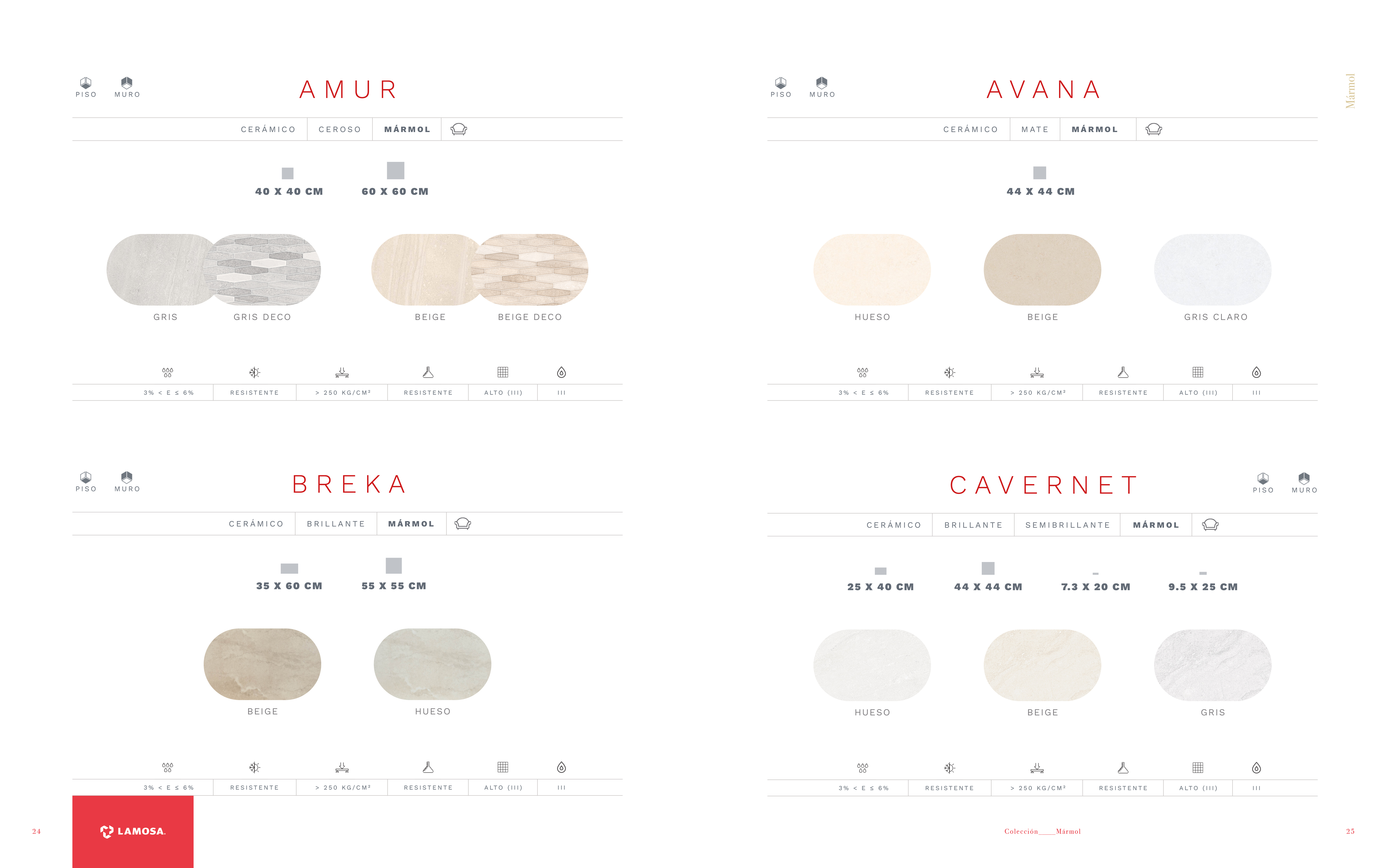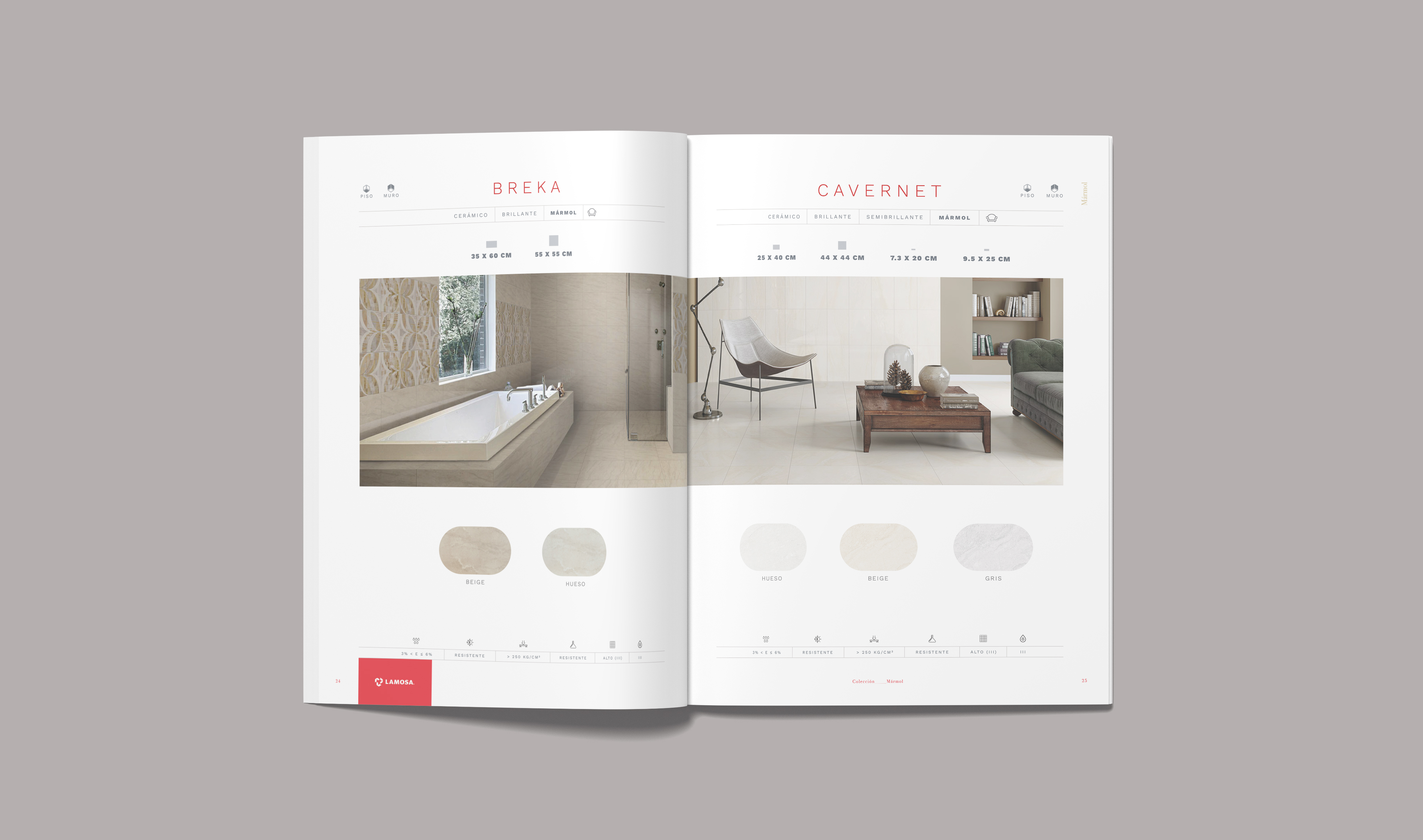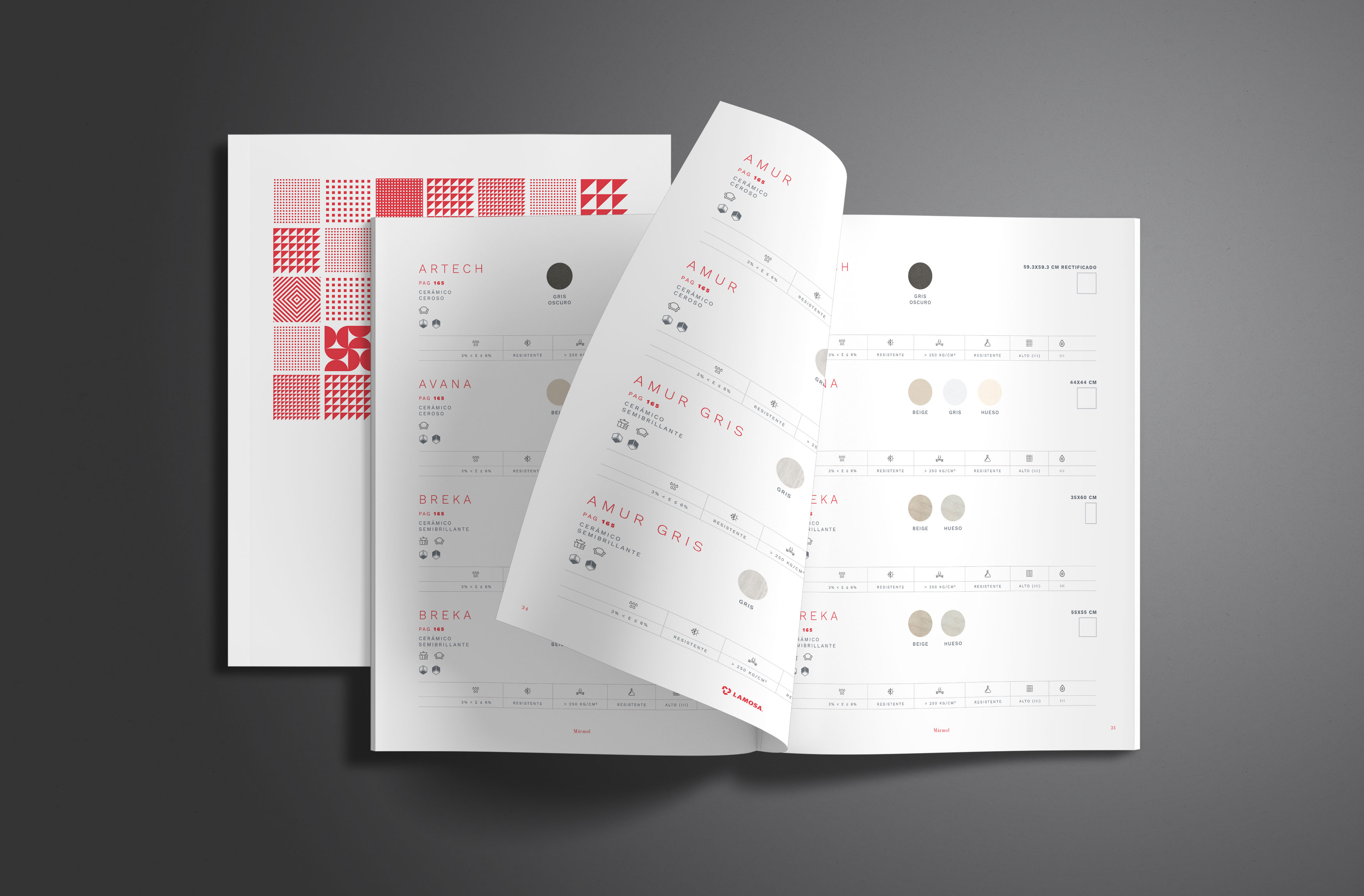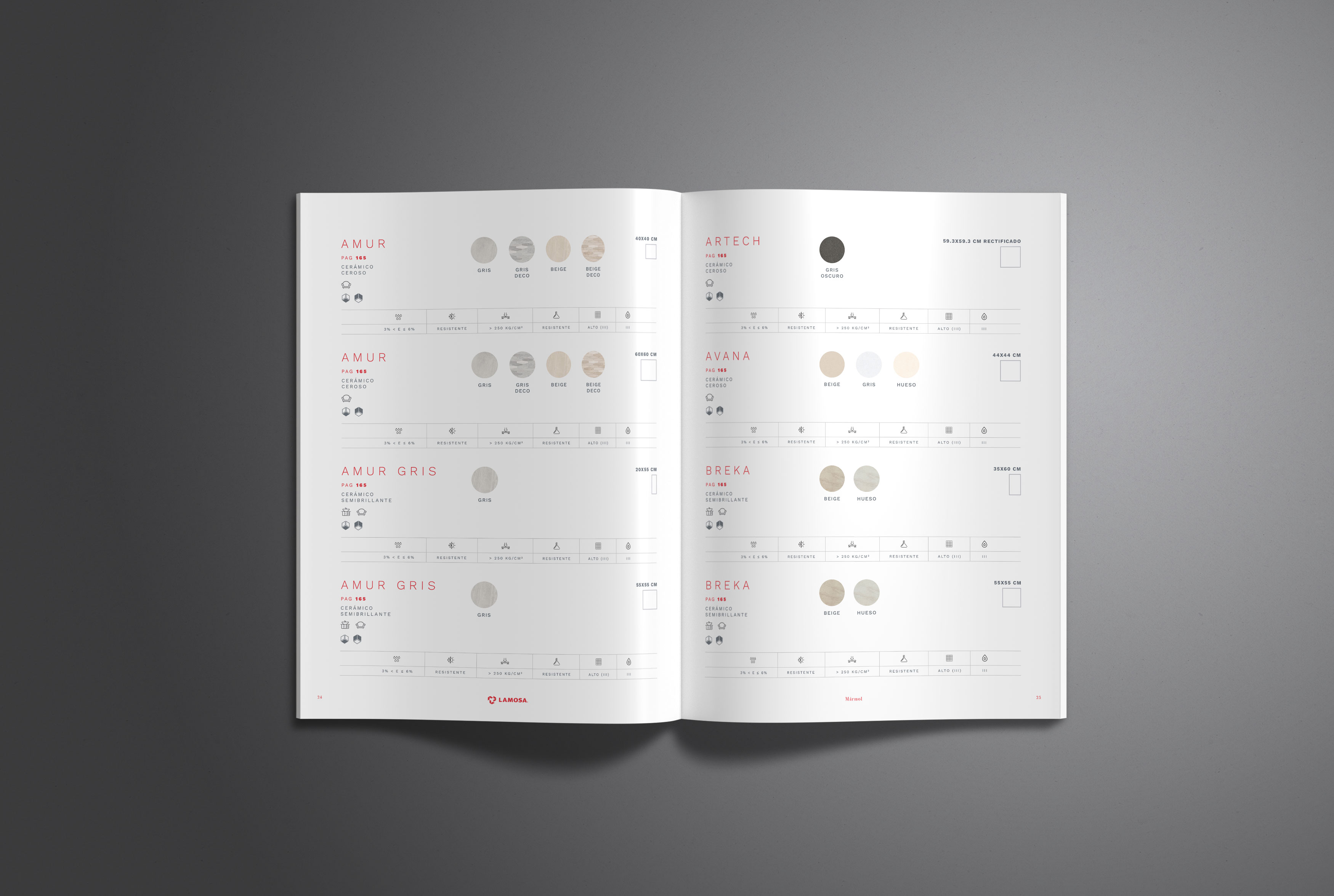 En cuanto a los colores hemos querido mostrar mucho más el rojo de Lamosa. Cada página queda muy corporativa gracias a los nombres de la serie en rojo y el logotipo de Lamosa sobre pastilla roja en la parte de abajo del pliego. También hemos creado una paleta de colores sobria y moderna para cada tipología.