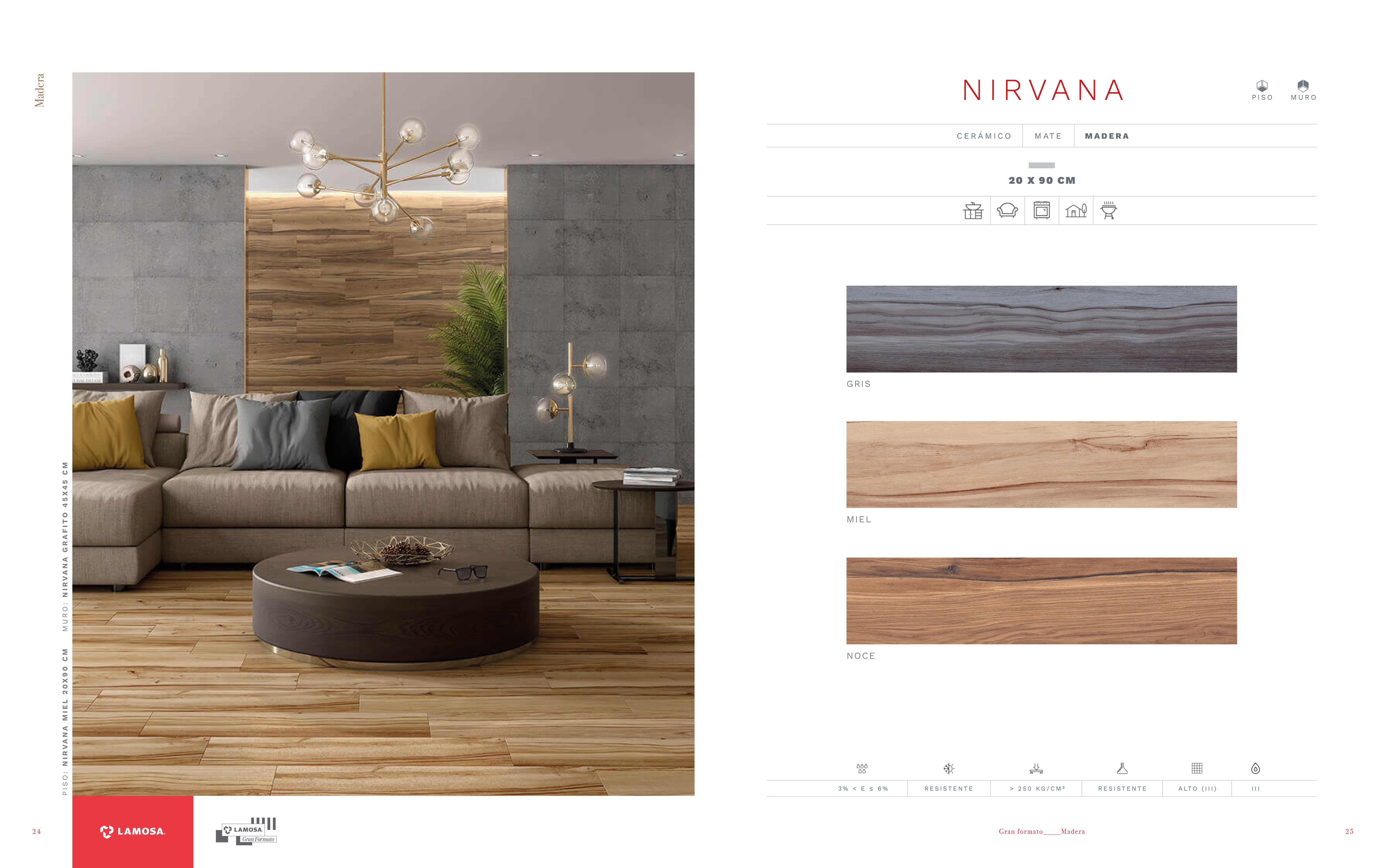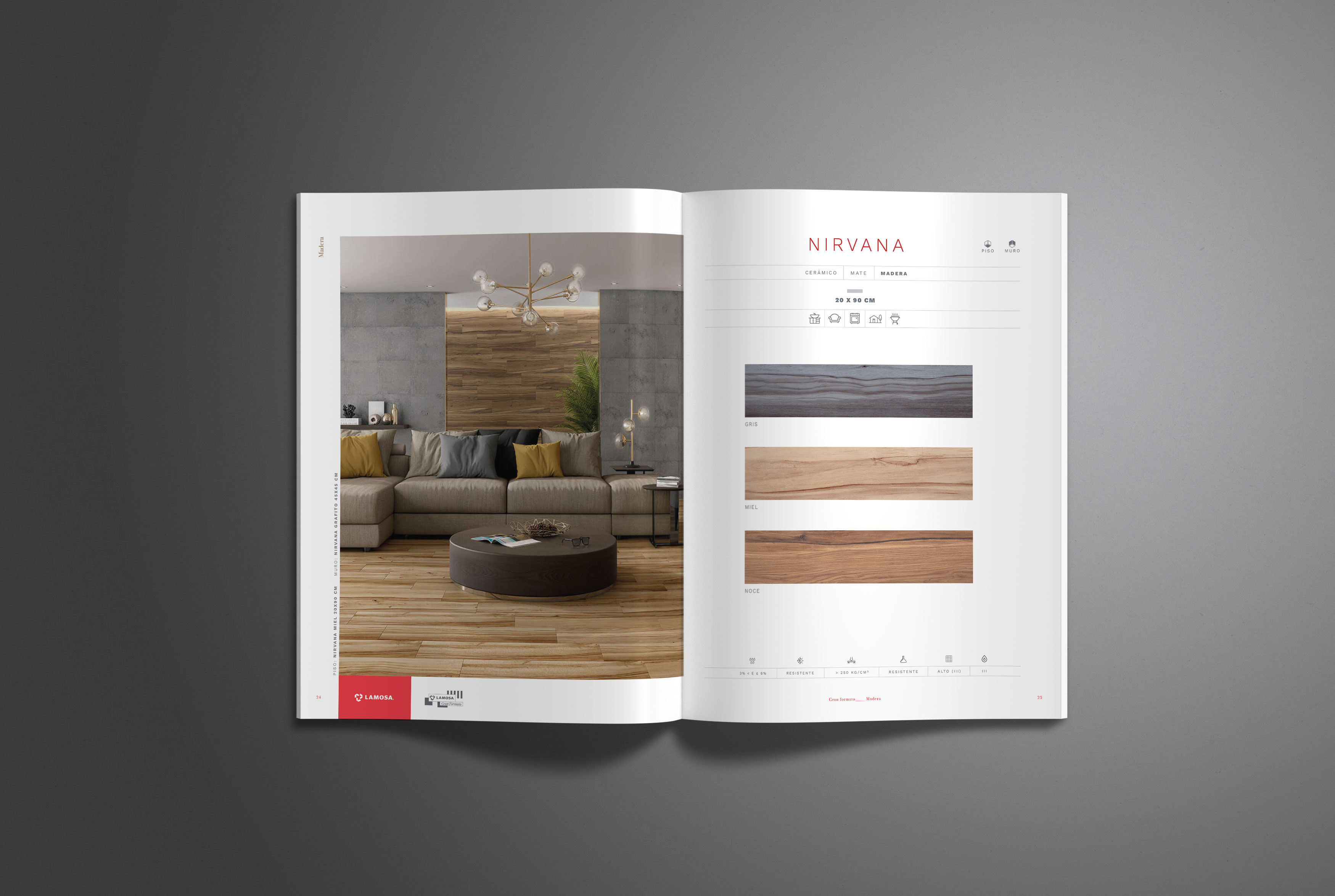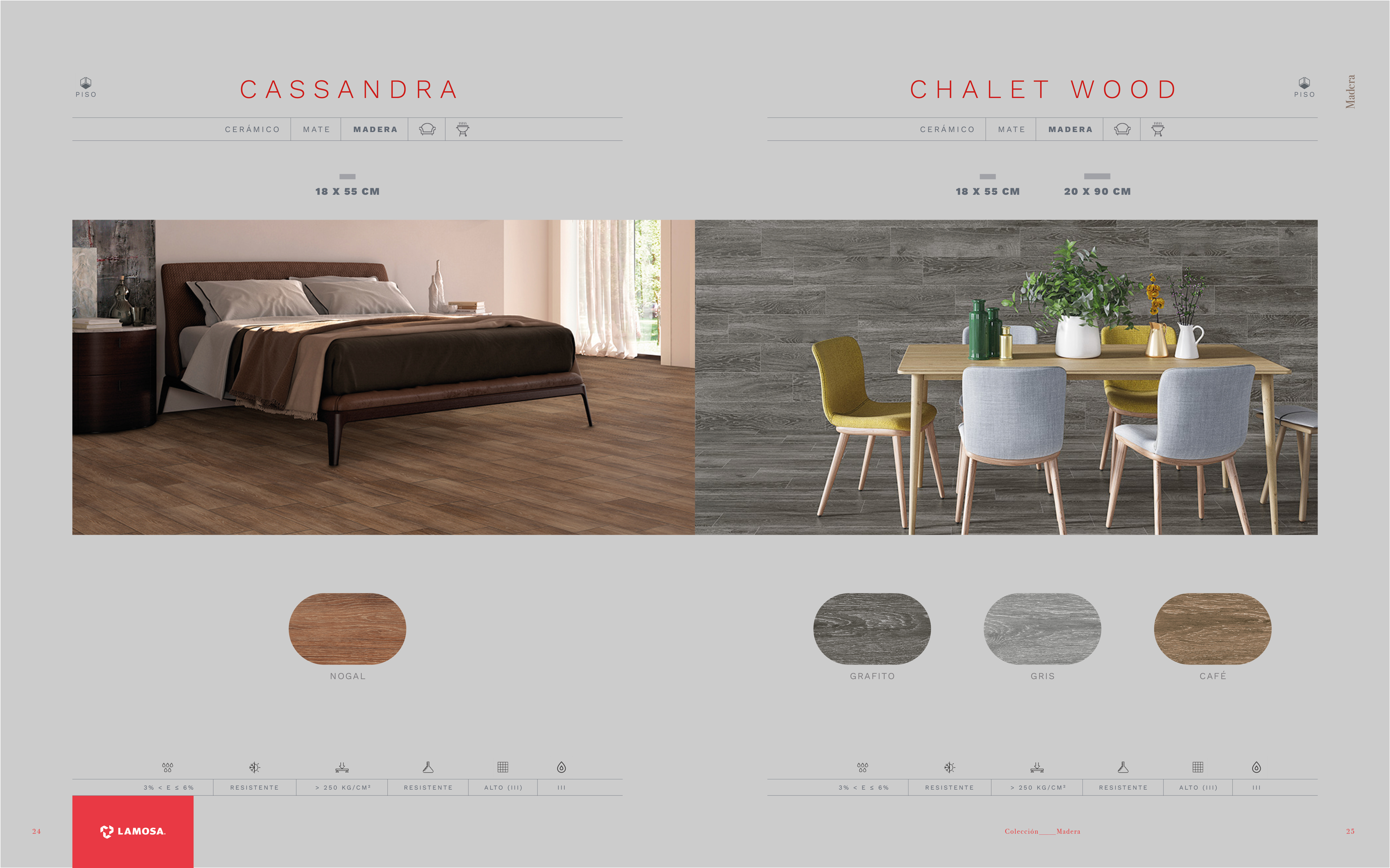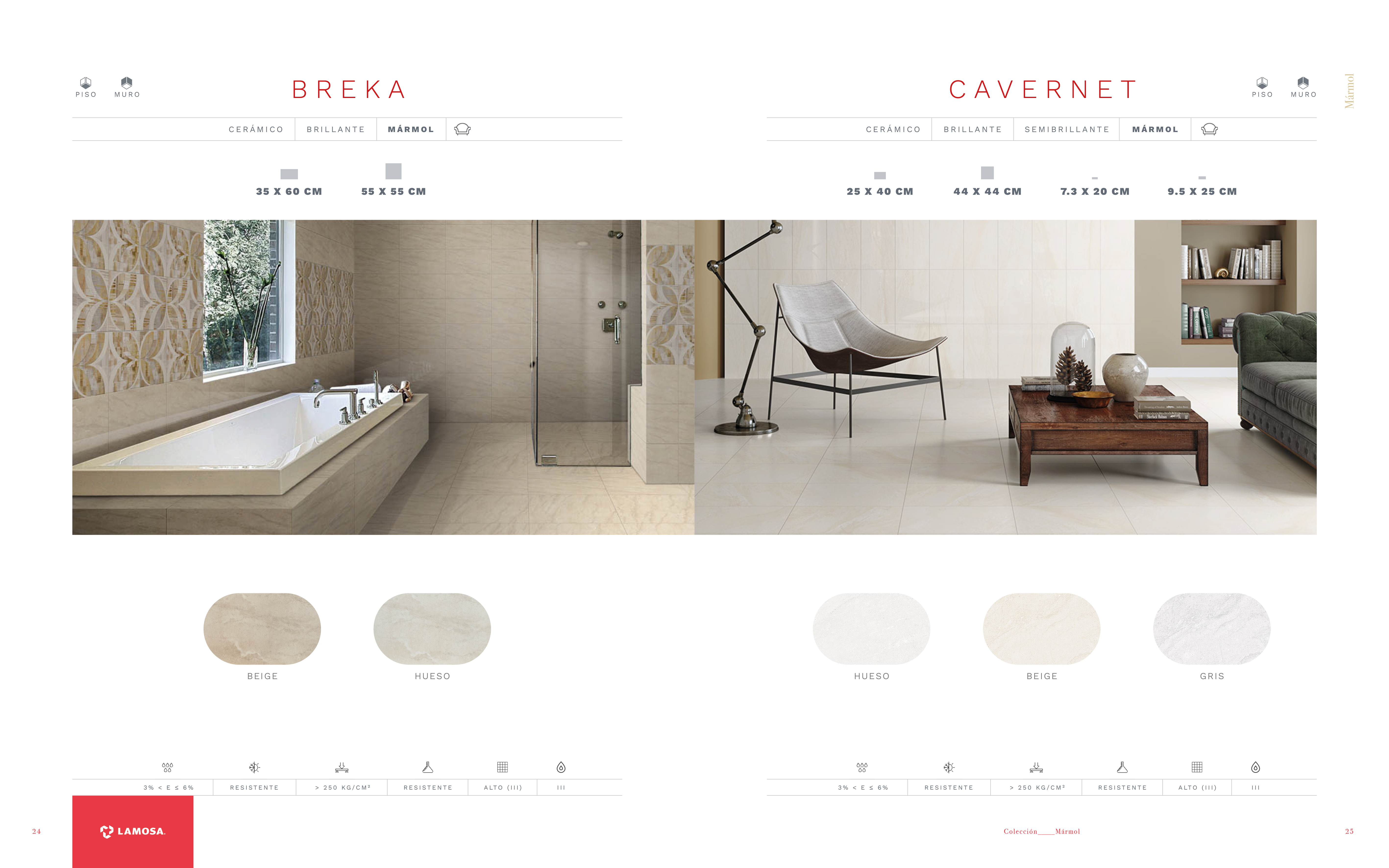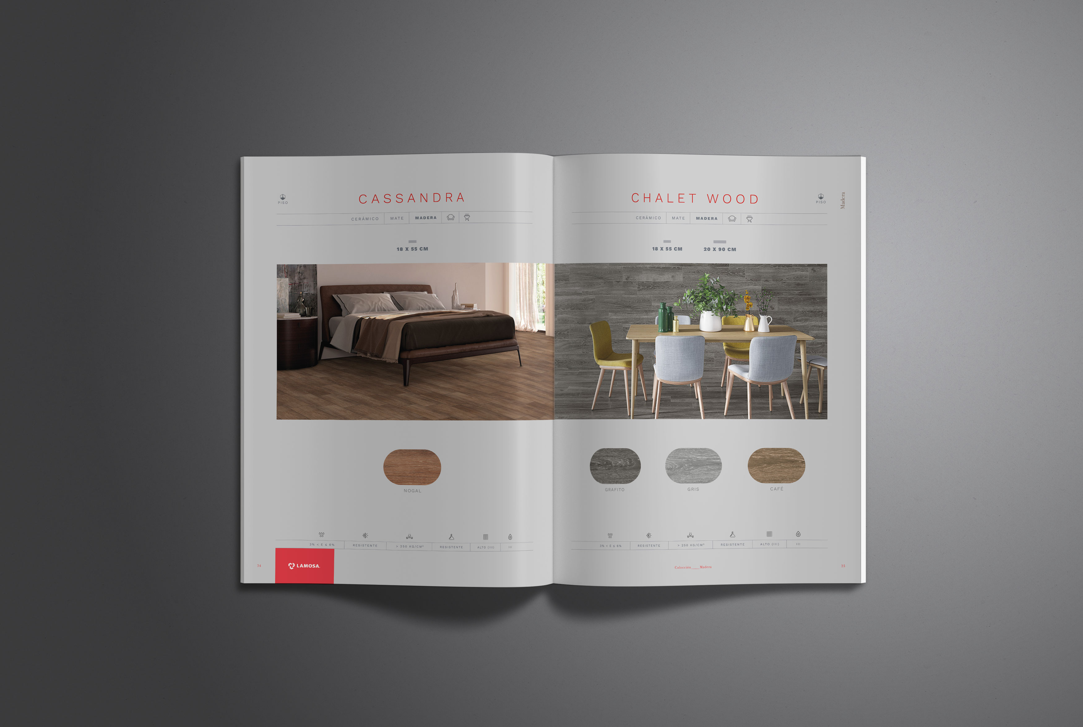 En cuanto a los colores hemos querido mostrar mucho más el rojo de Lamosa. Cada página queda muy corporativa gracias a los nombres de la serie en rojo y el logotipo de Lamosa sobre pastilla roja en la parte de abajo del pliego. También hemos creado una paleta de colores sobria y moderna para cada tipología.