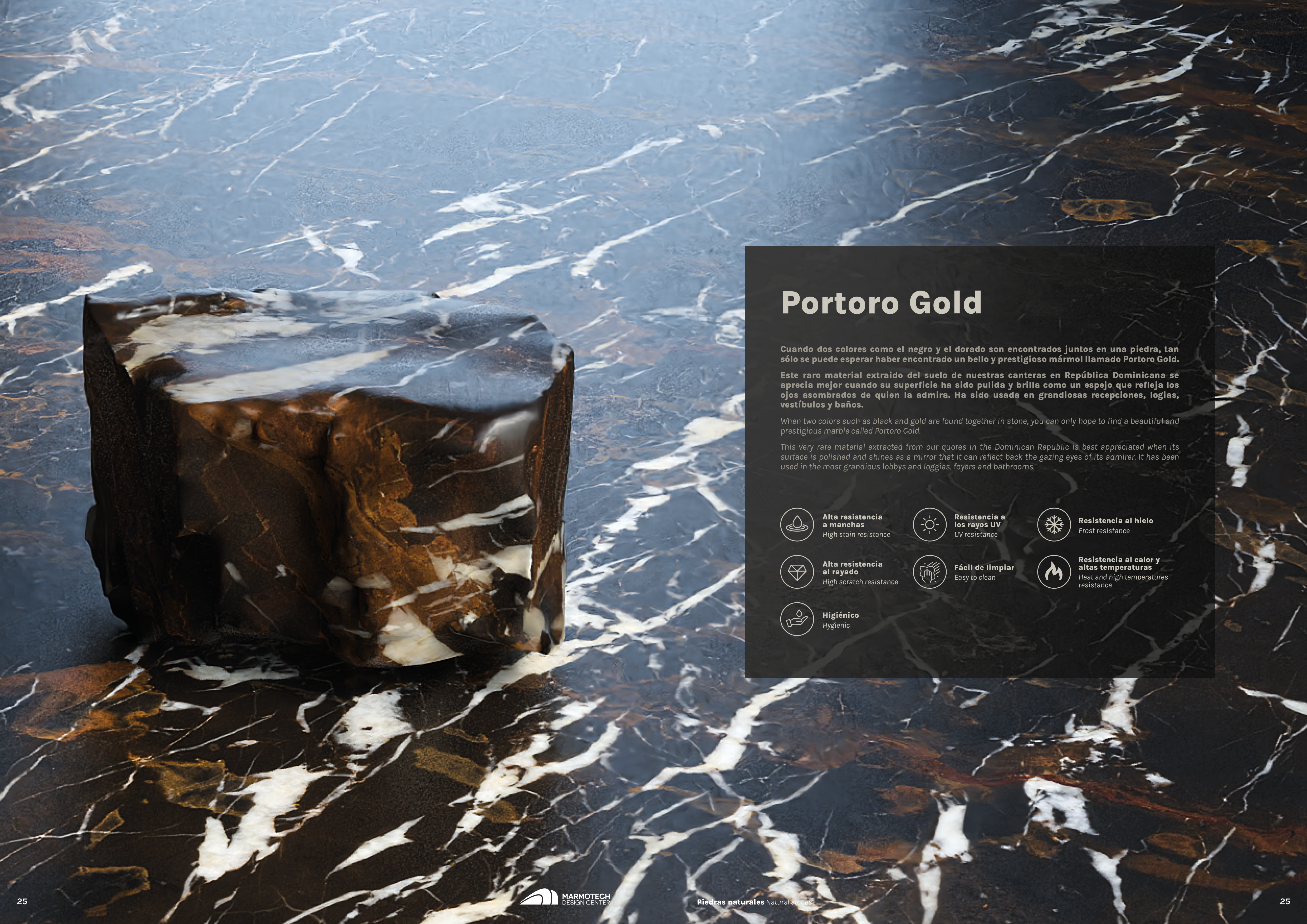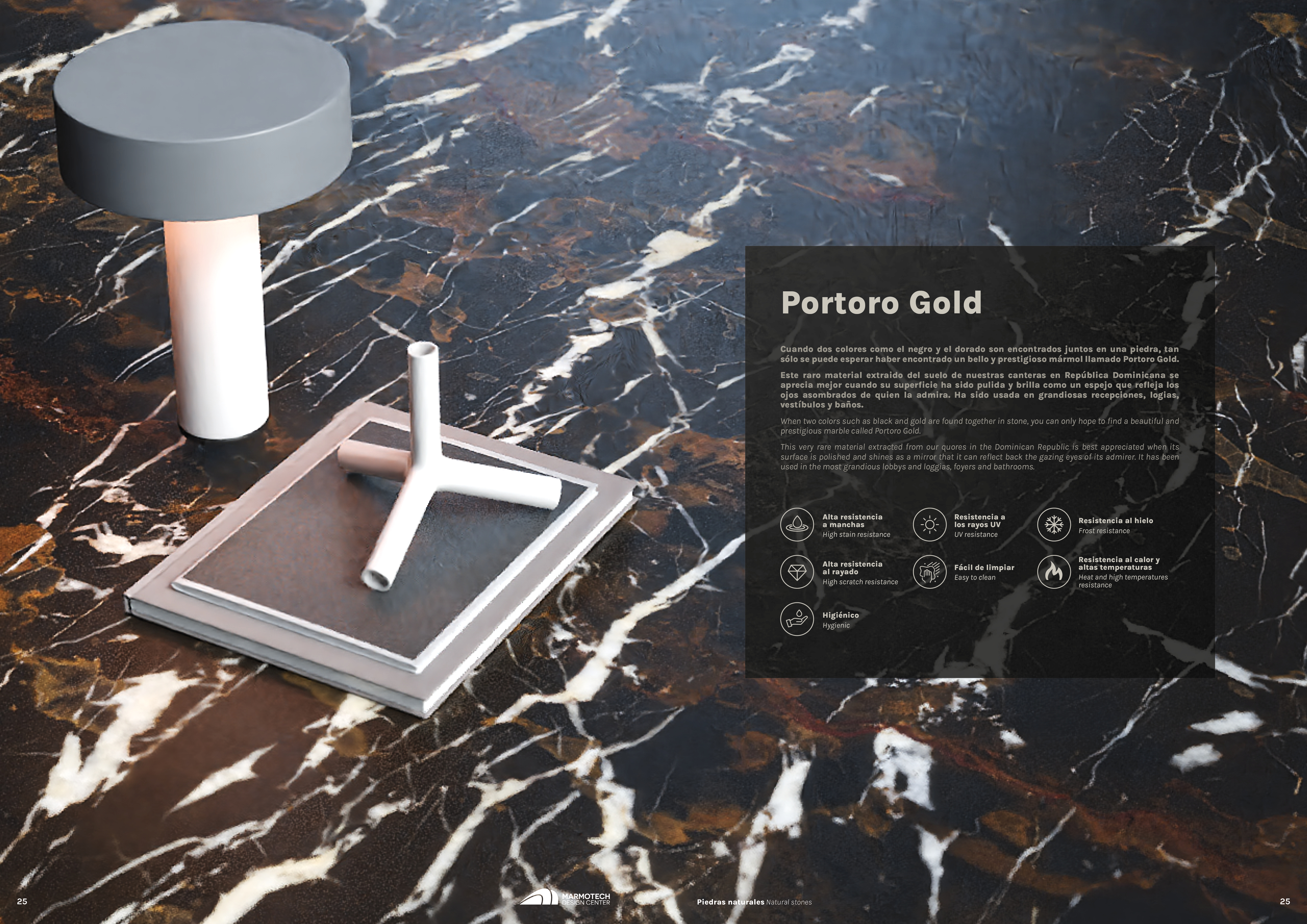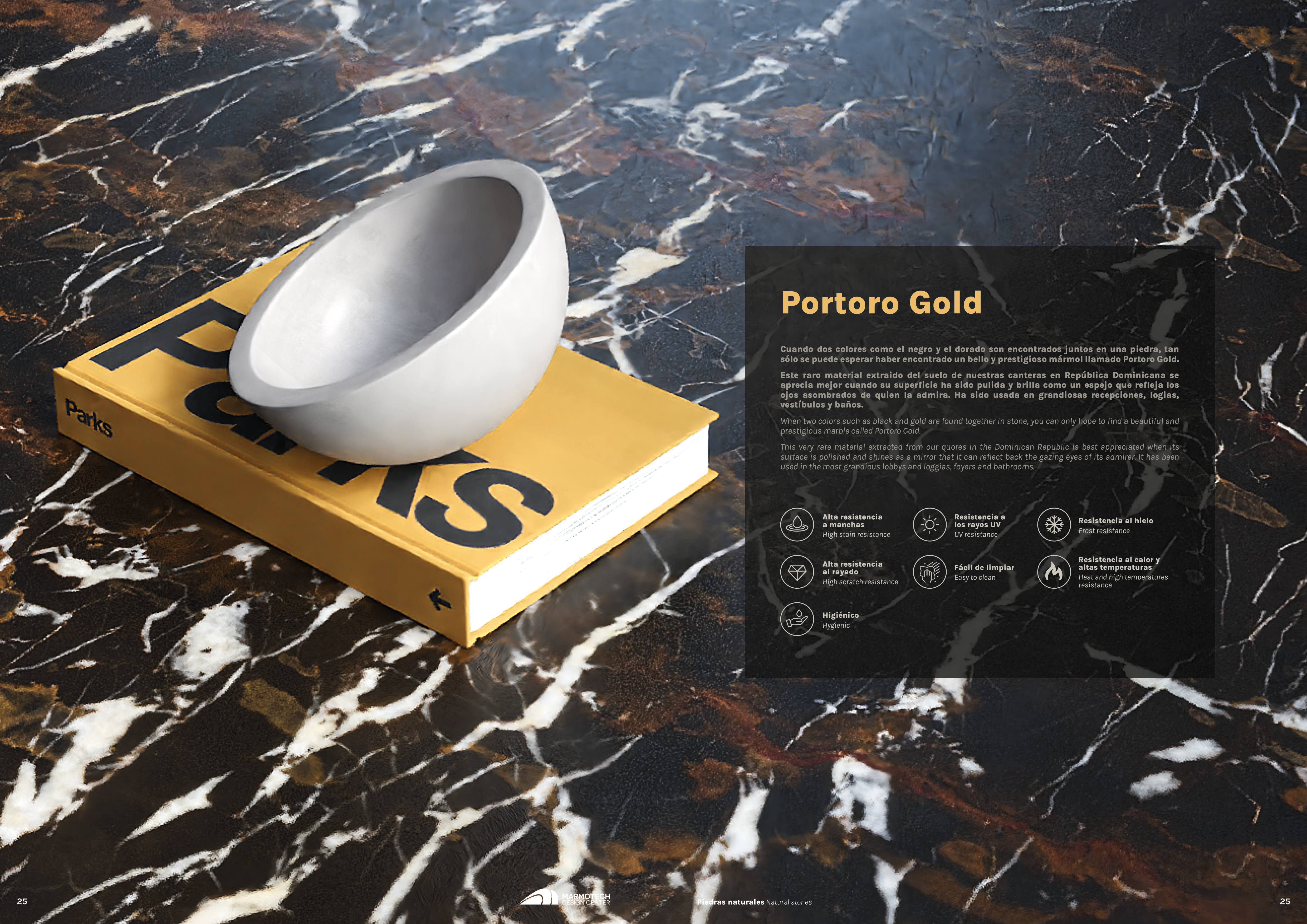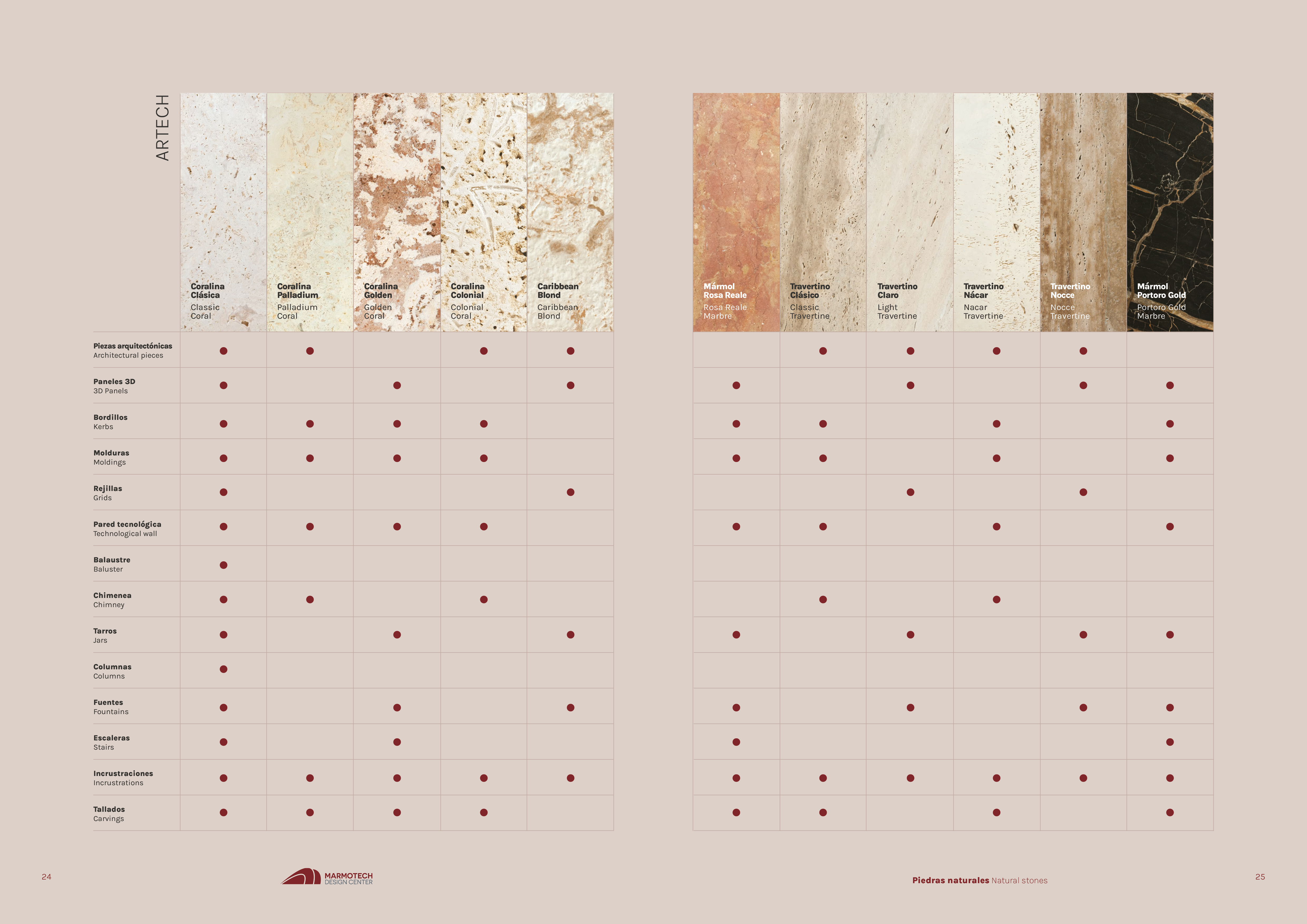 - Fichas técnicas de los 14 productos locales (Portoro Gold, 9 Coralinas, 3 Travertinos y Caribbean Blond).