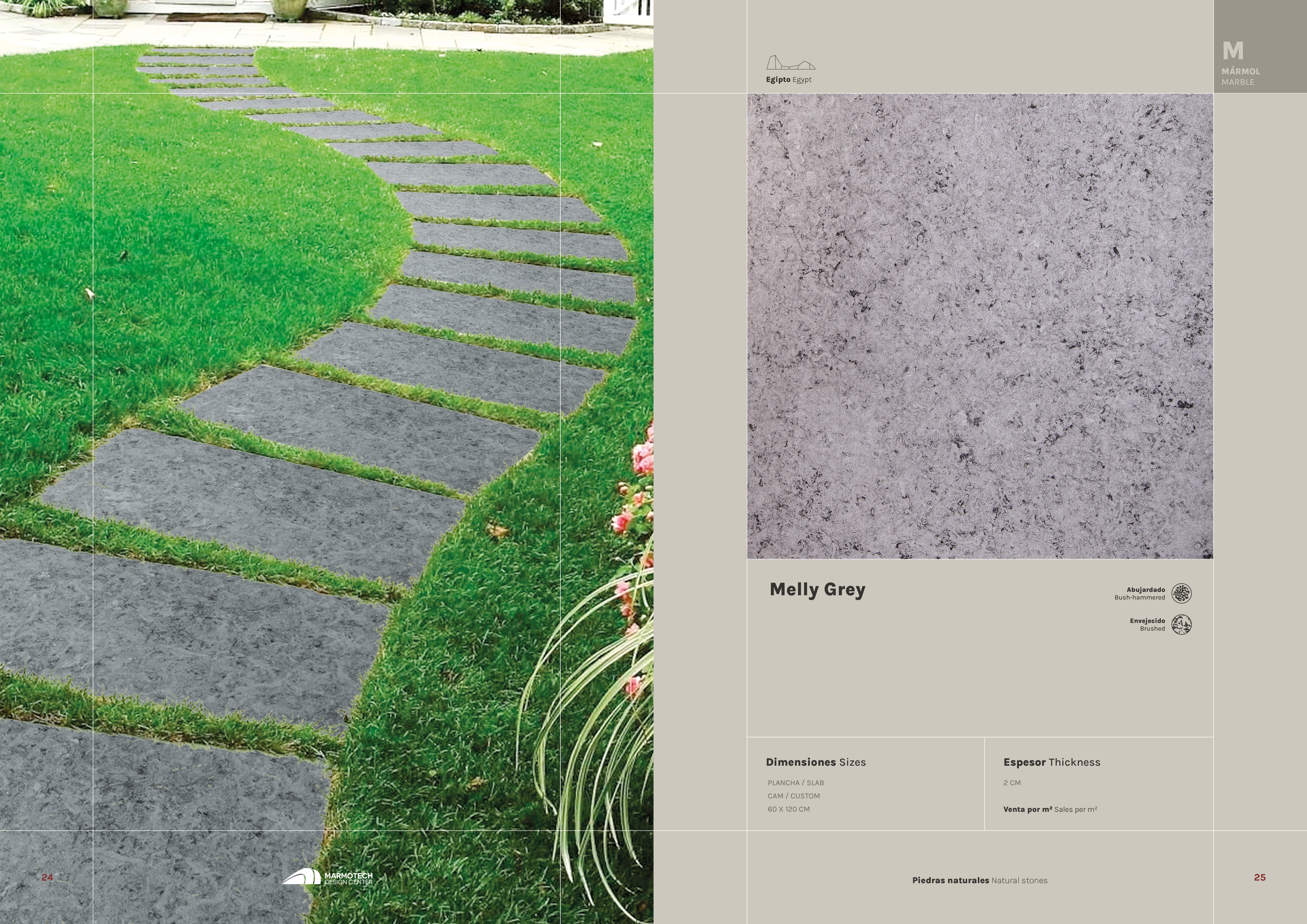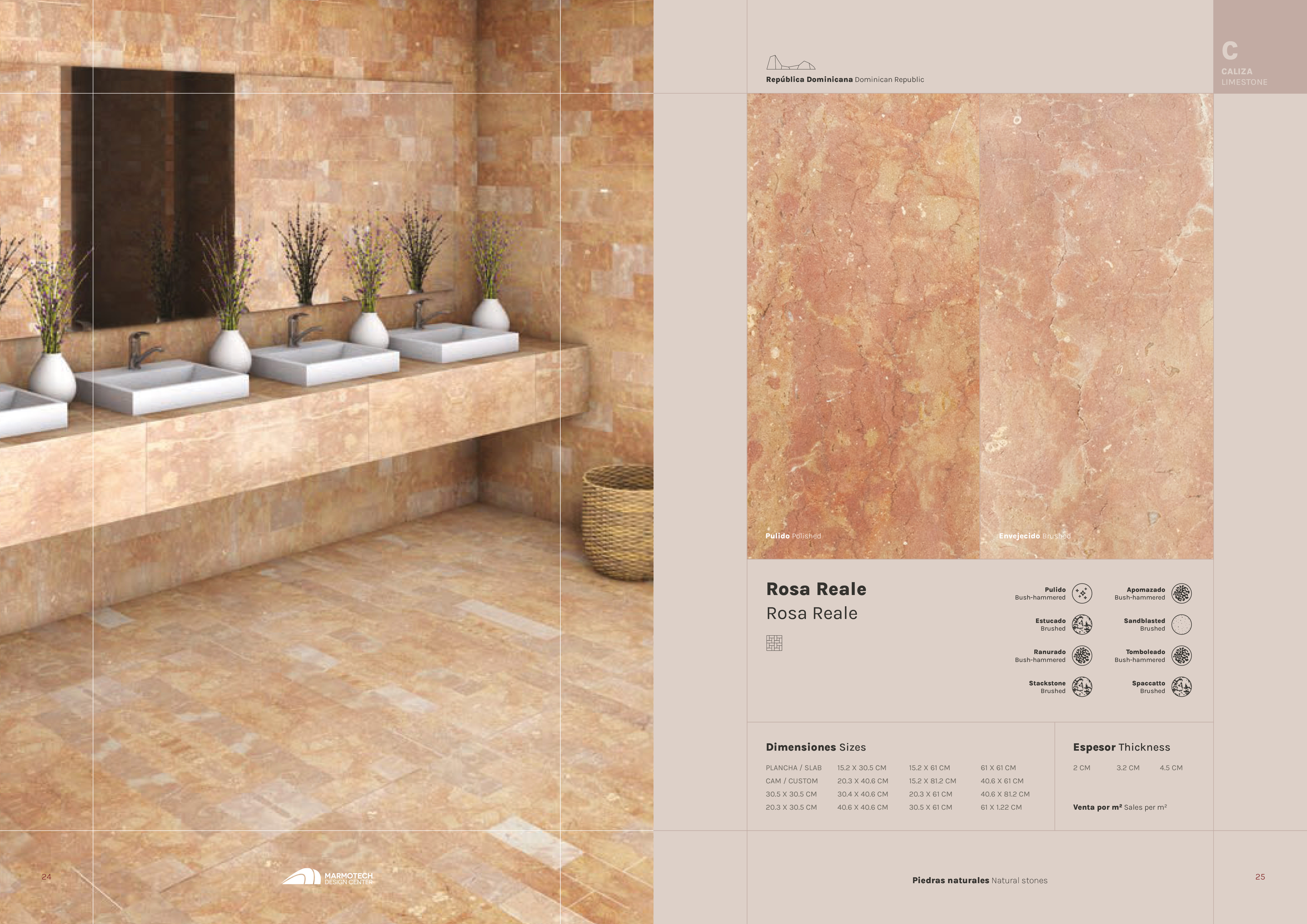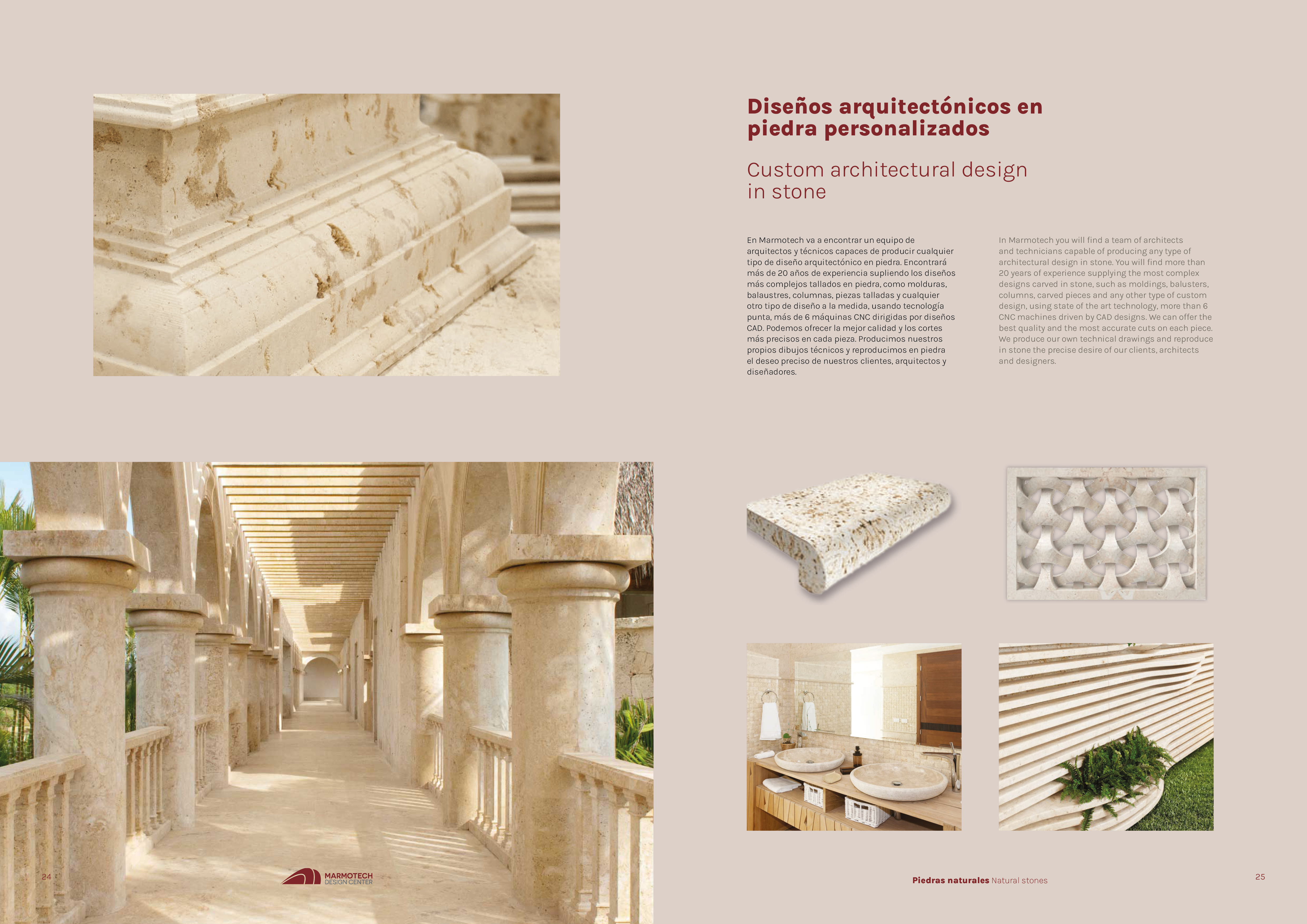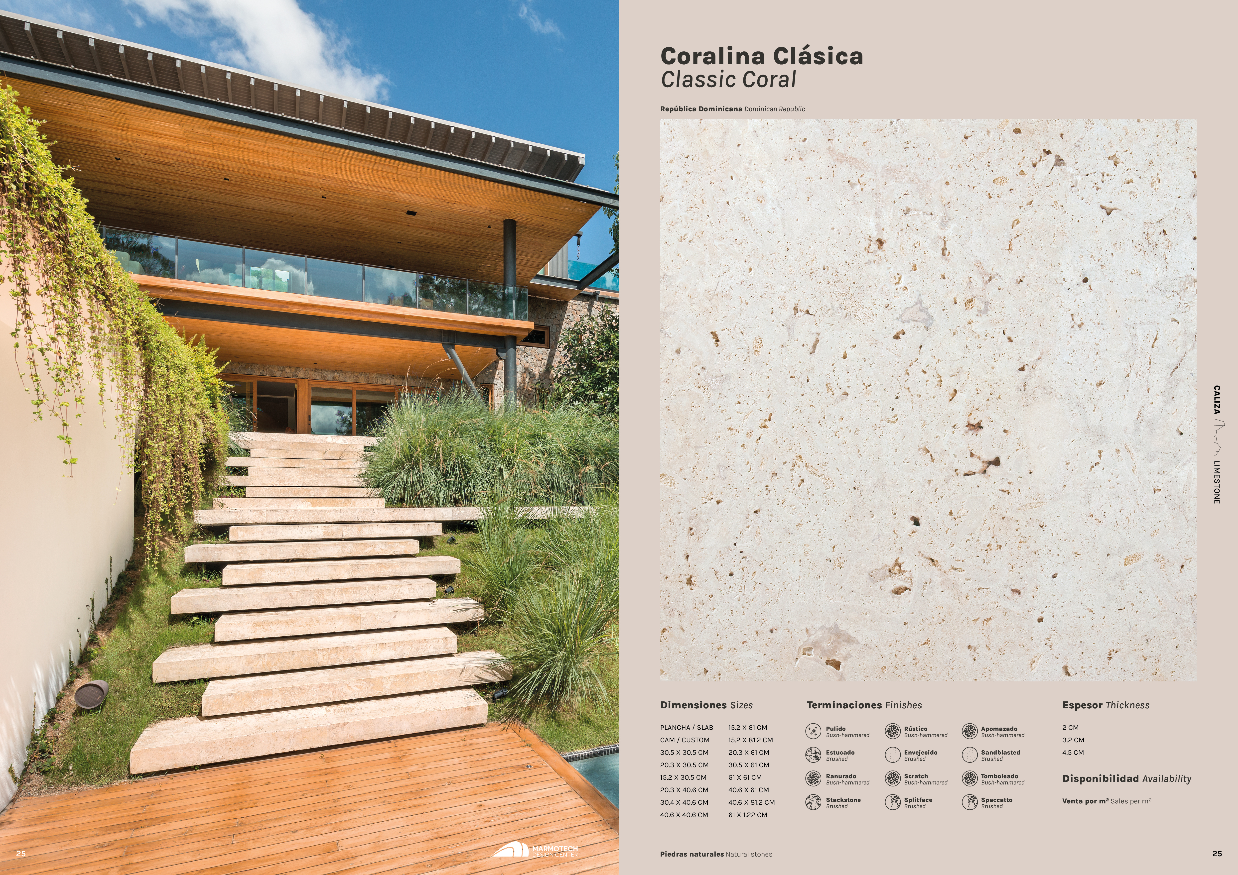 - Fichas técnicas de los 218 productos ordenados en 14 categorías (Areniscas, Basaltos, Coralinas, Cuarcitas, Granitos, Jade, Calizas, Mármoles, Onyx, Pizarras, Travertinos, Piedras Semipreciosas, Roca volcánica y Dolomita)