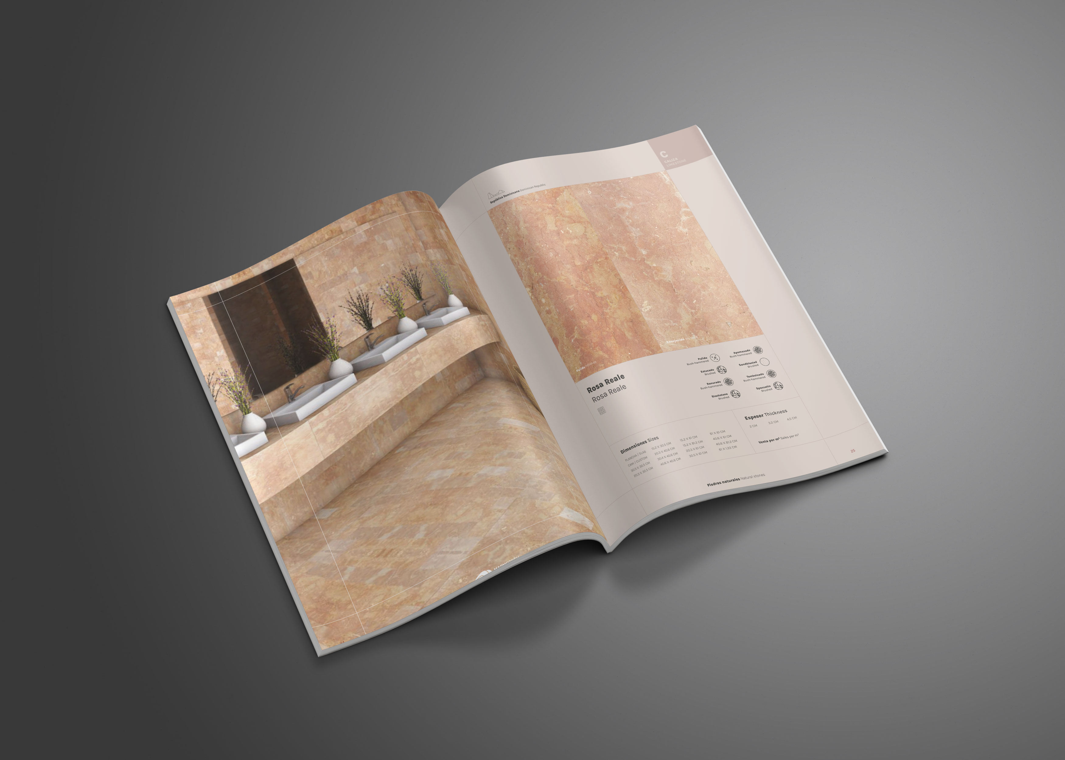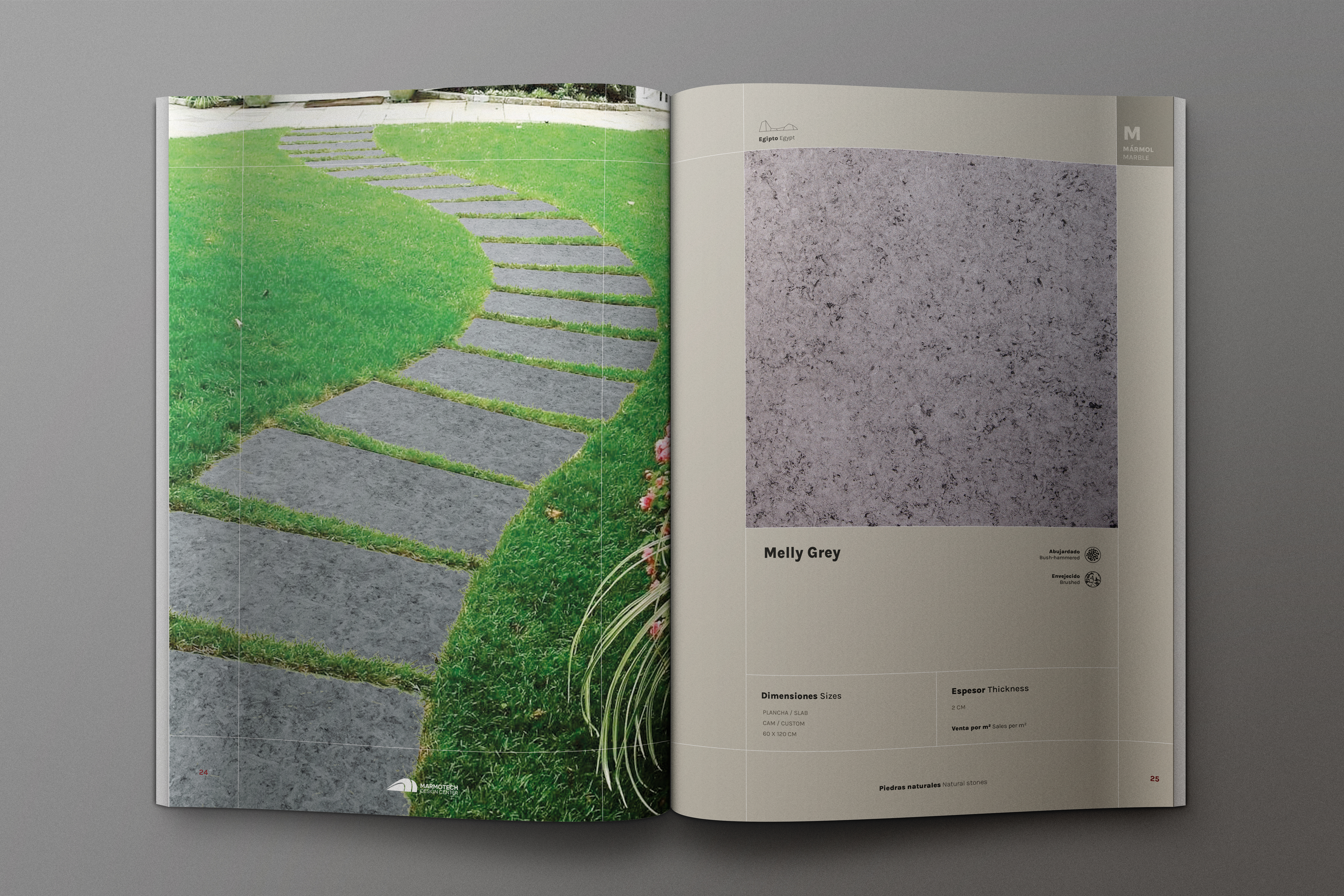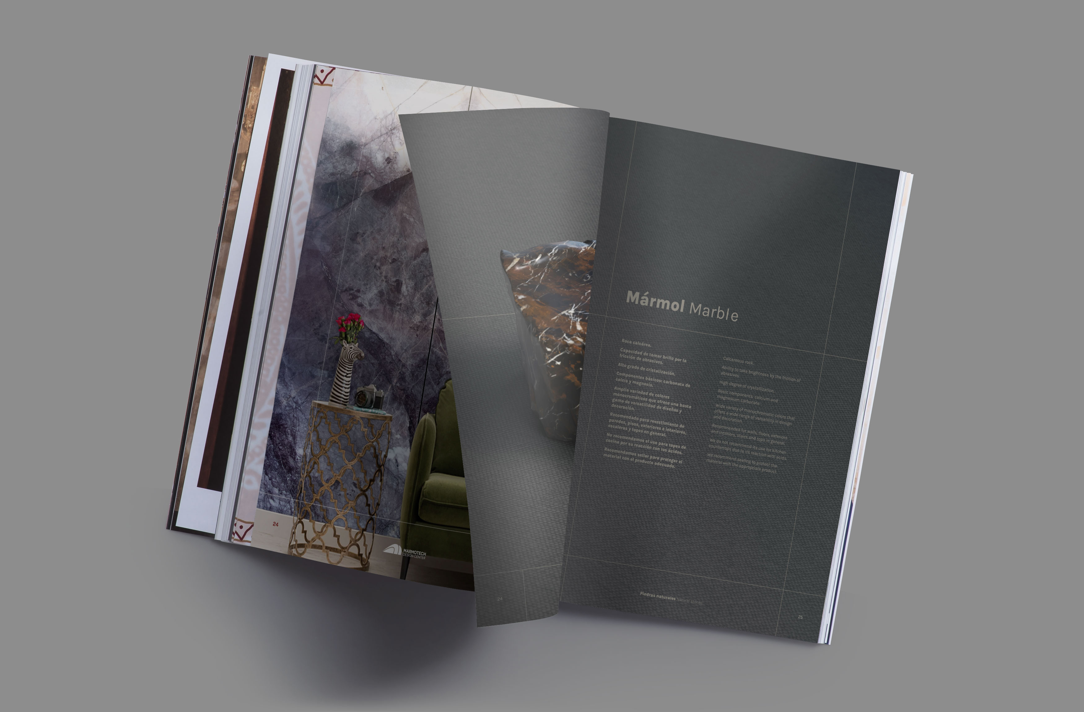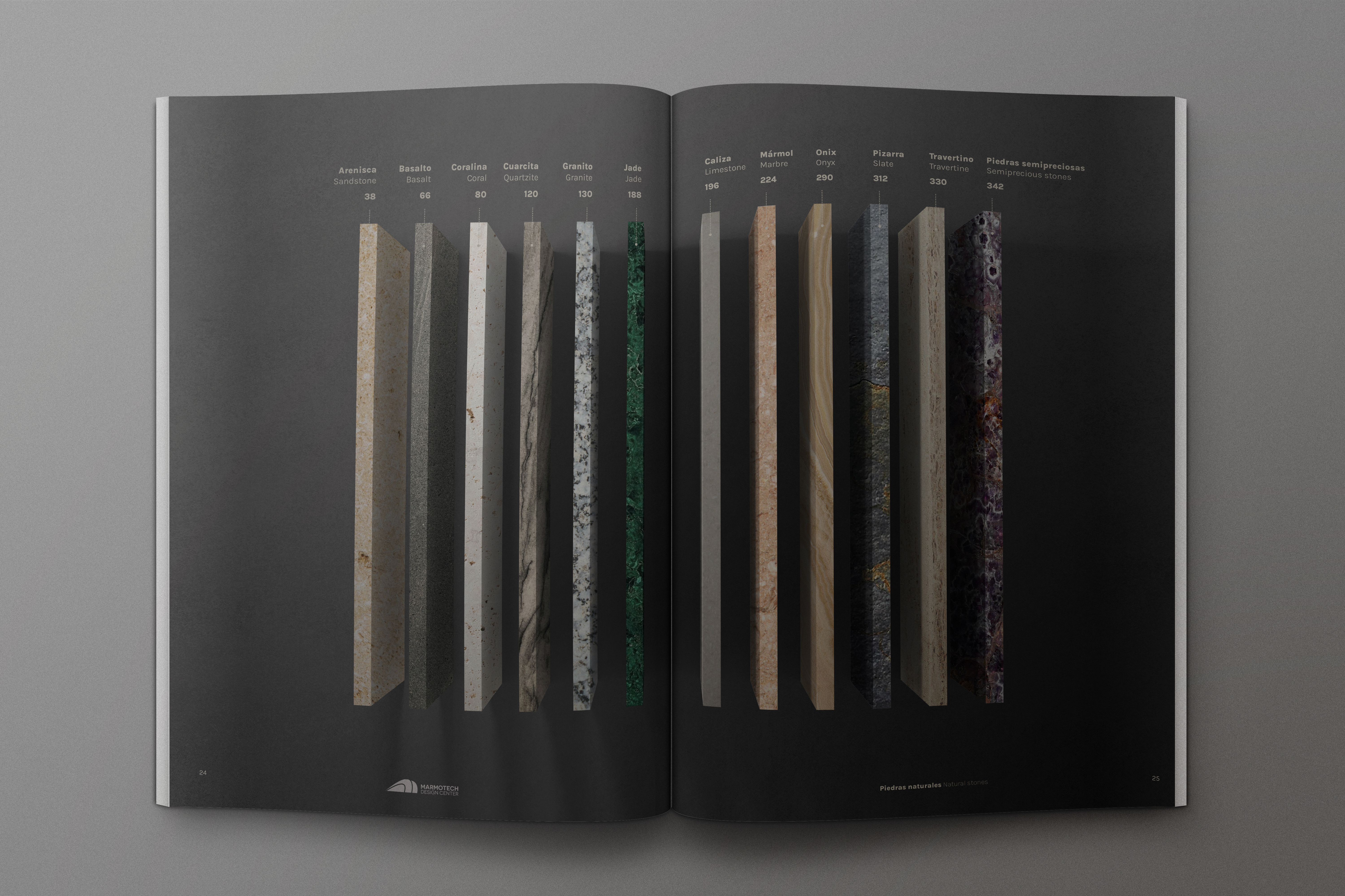 El catálogo cuenta con una serie de finas líneas que nos sirven para estructurar las zonas donde va la información. También hemos creado una amplia iconografía (mosaicos, bookmatch, semipreciosas, acabados, procedencia, etc.), que junto a las líneas finas le dan un aspecto global muy técnico y ordenado.