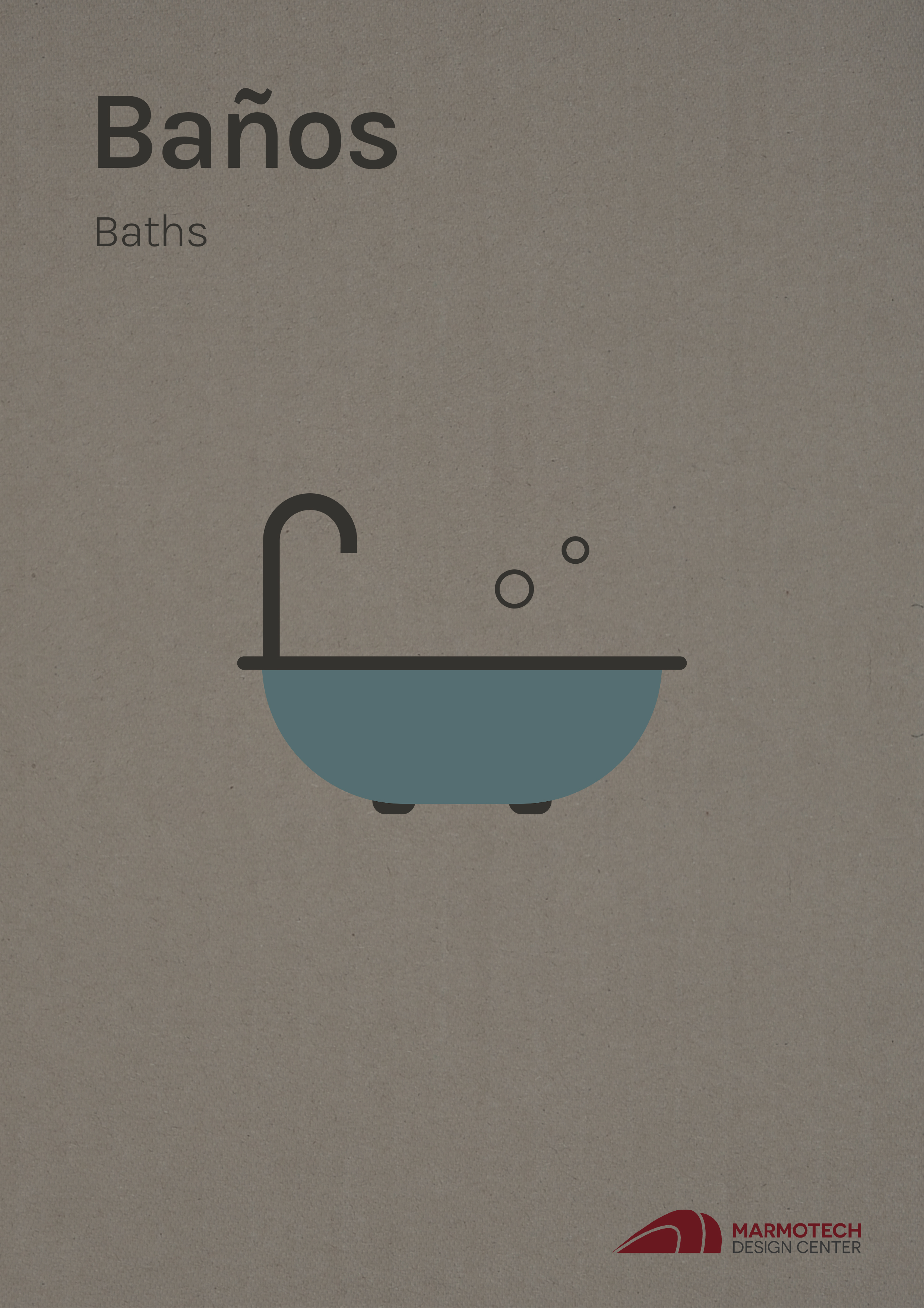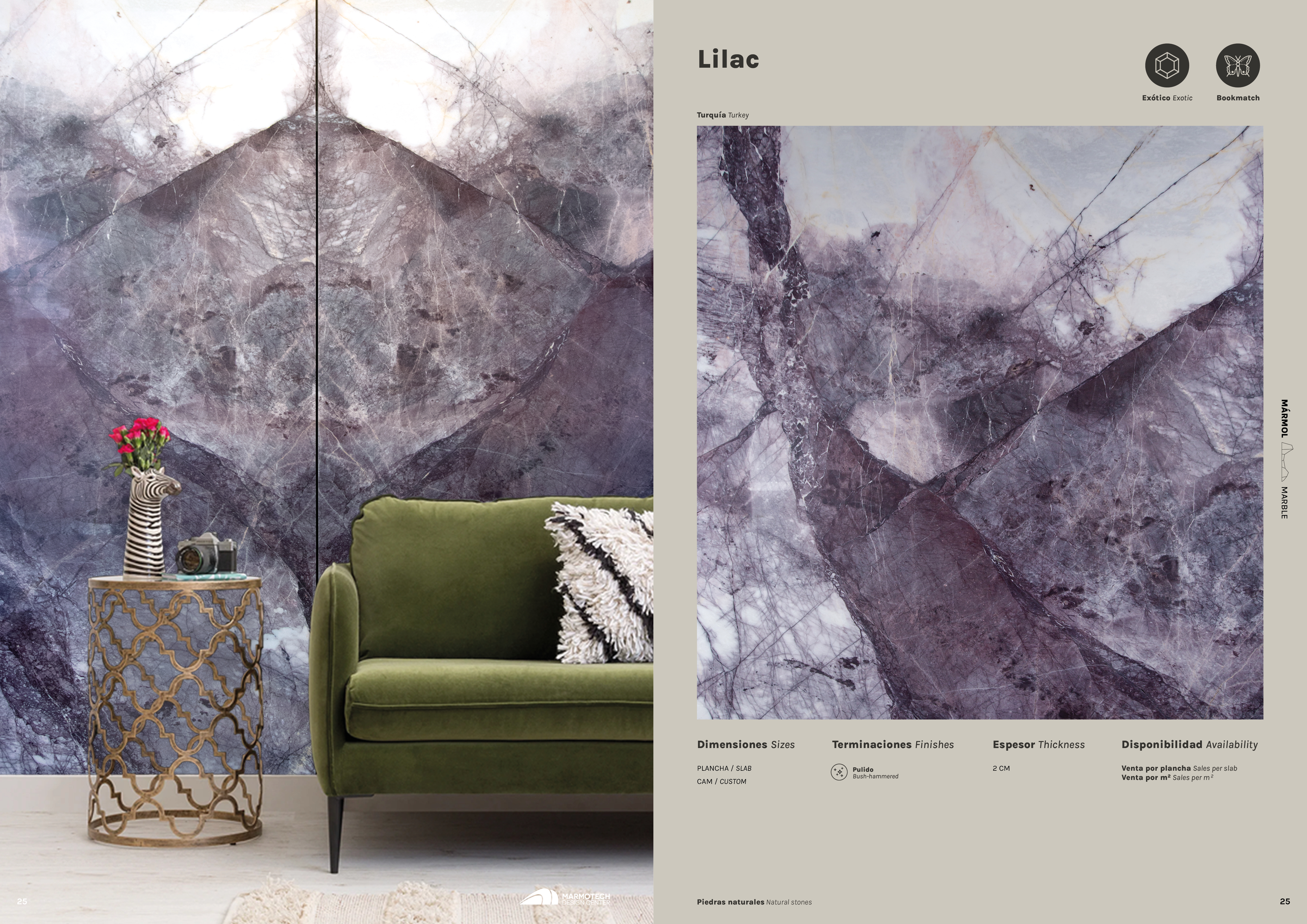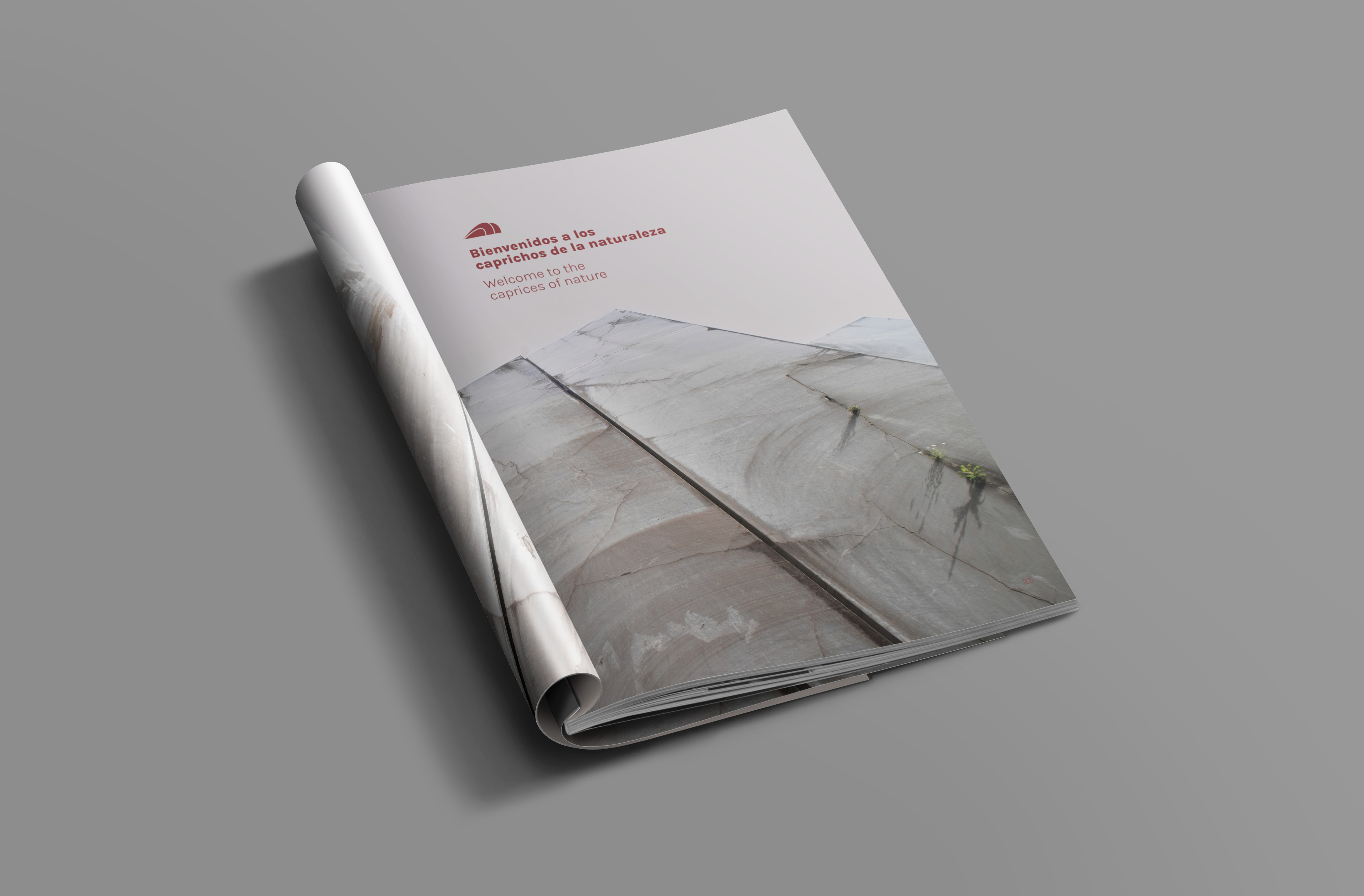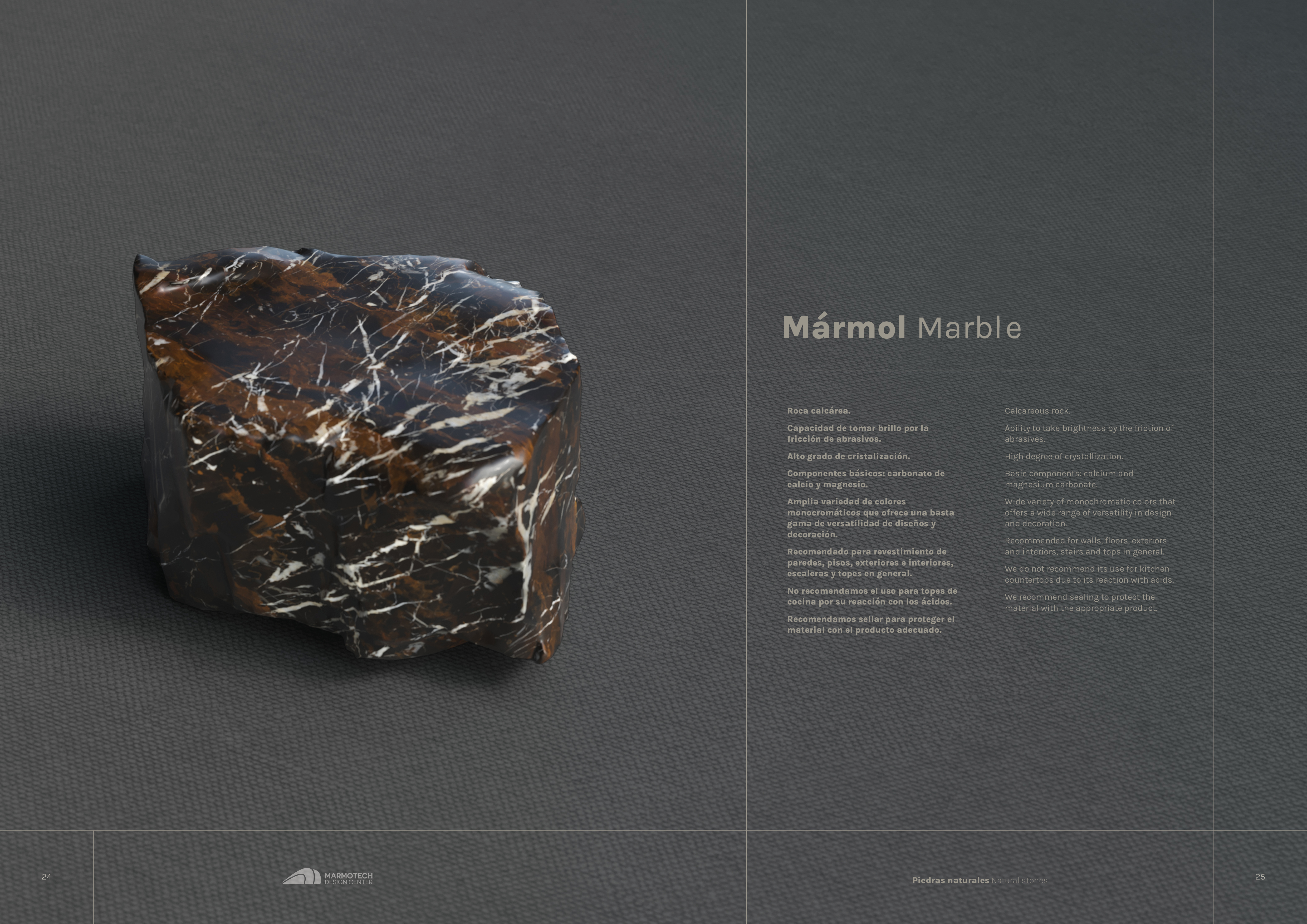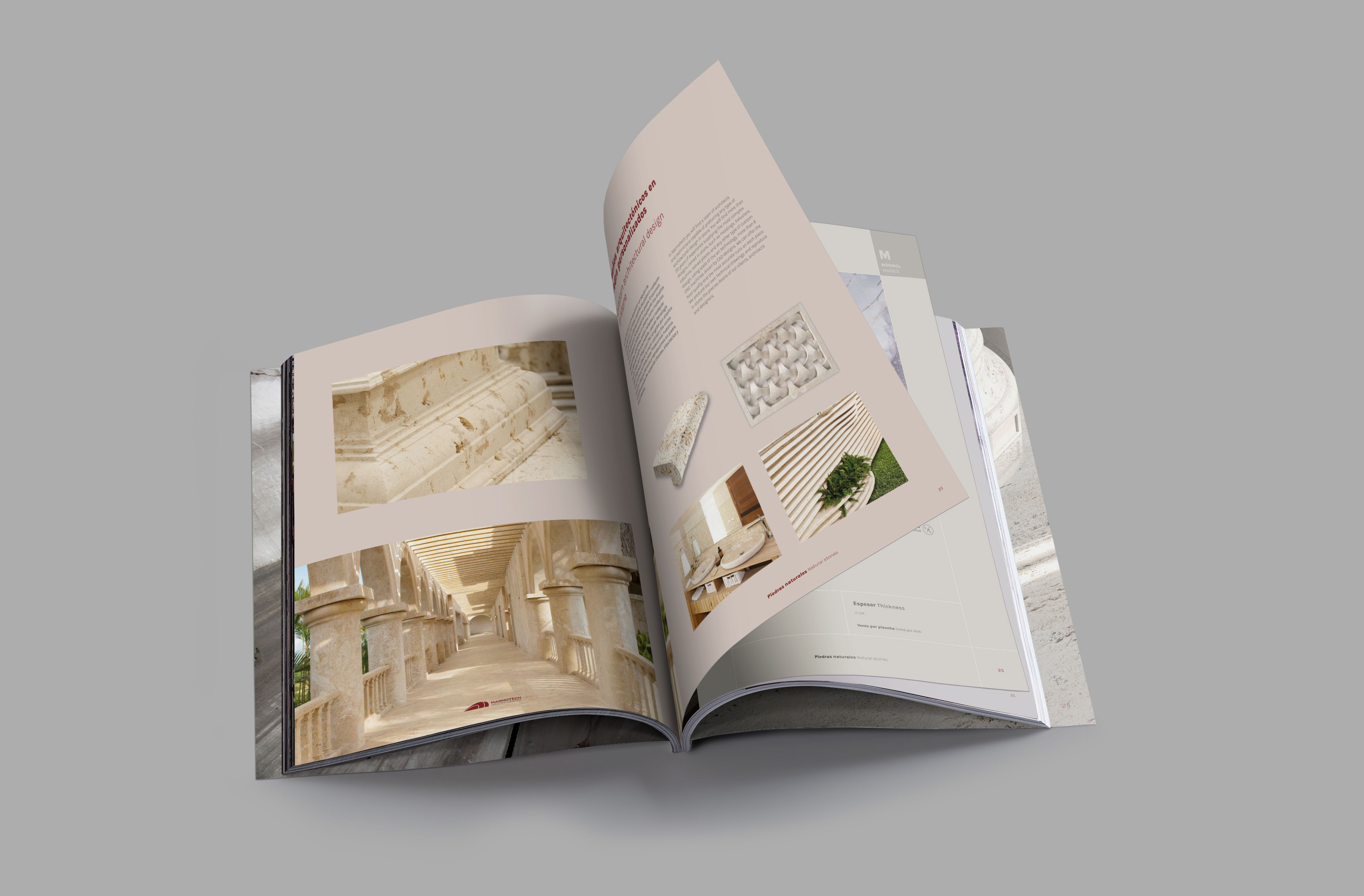 El catálogo cuenta con una serie de finas líneas que nos sirven para estructurar las zonas donde va la información. También hemos creado una amplia iconografía (mosaicos, bookmatch, semipreciosas, acabados, procedencia, etc.), que junto a las líneas finas le dan un aspecto global muy técnico y ordenado.