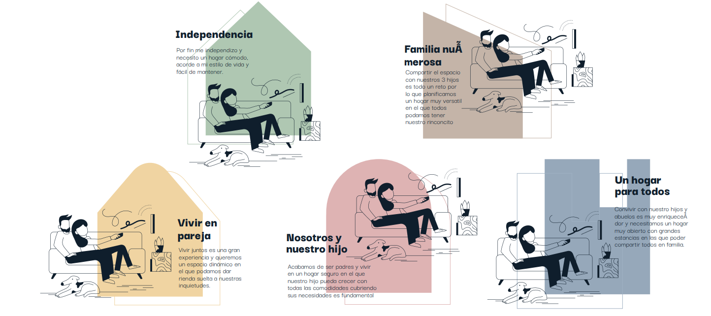 The campaign has been developed on the basis of the concept "connect with the way you live". Based on five types of family, icons have been created with different house shapes and a colour has been assigned to each of them, to differentiate them and so that the target audience can see themselves represented.