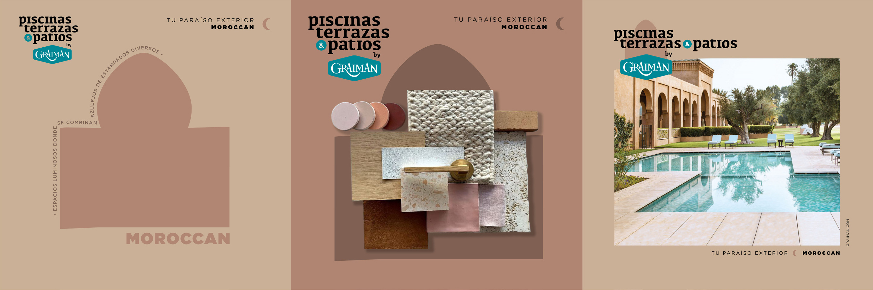 Following the success of the "Bathrooms & Kitchens" campaign, we were commissioned to create a similar campaign focused on Swimming Pools, Terraces and Patios. We created a dual concept: "Go outside". On the one hand, we encouraged the public to go outside their home, to discover the possibilities of that space in their home that they probably hadn't thought of. And also to go out into the world to discover new cultures. "Pools, terraces & patios by Graiman" is a journey through 8 different countries, where you can find a lot of ideas and inspirations to build or remodel the outdoor space.