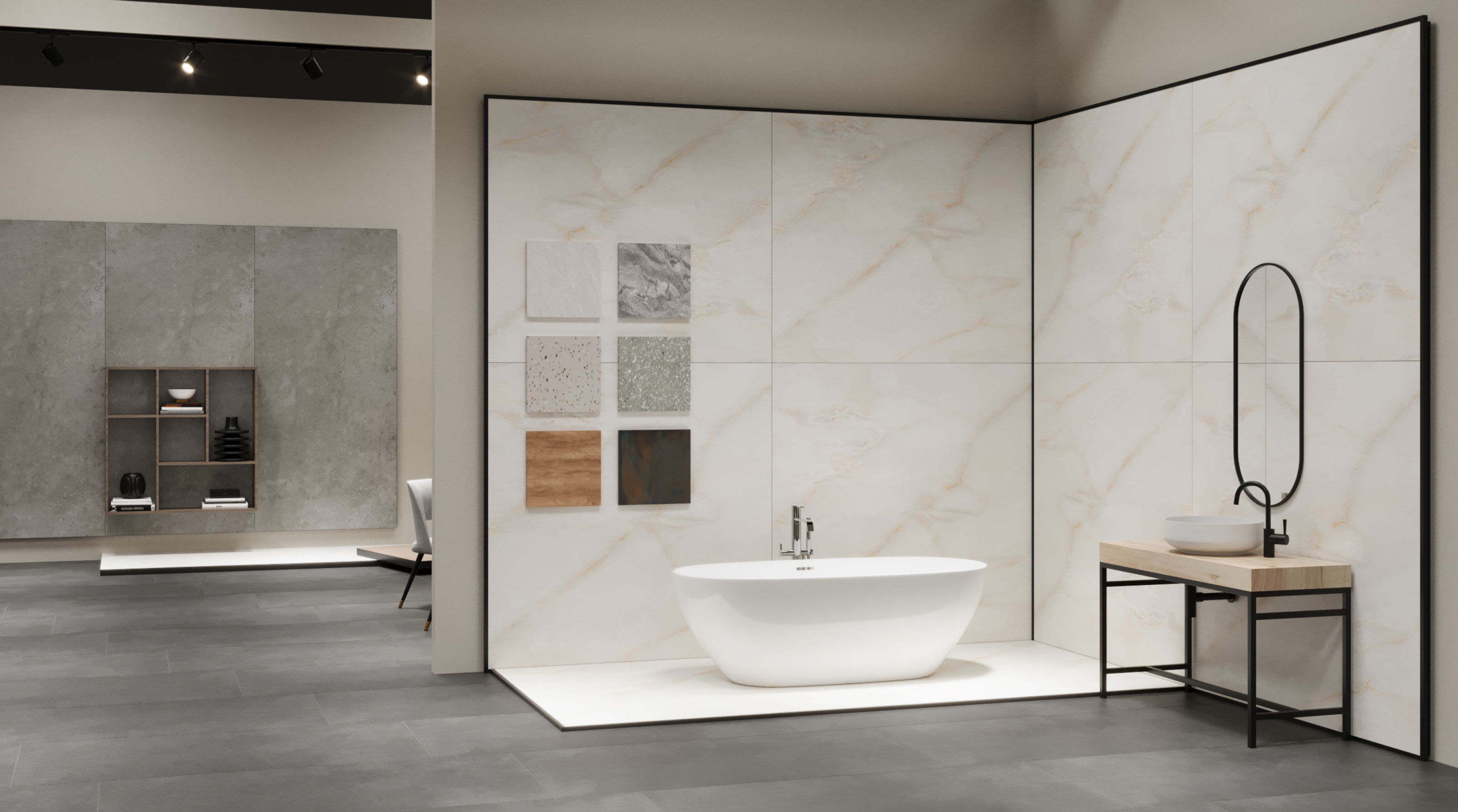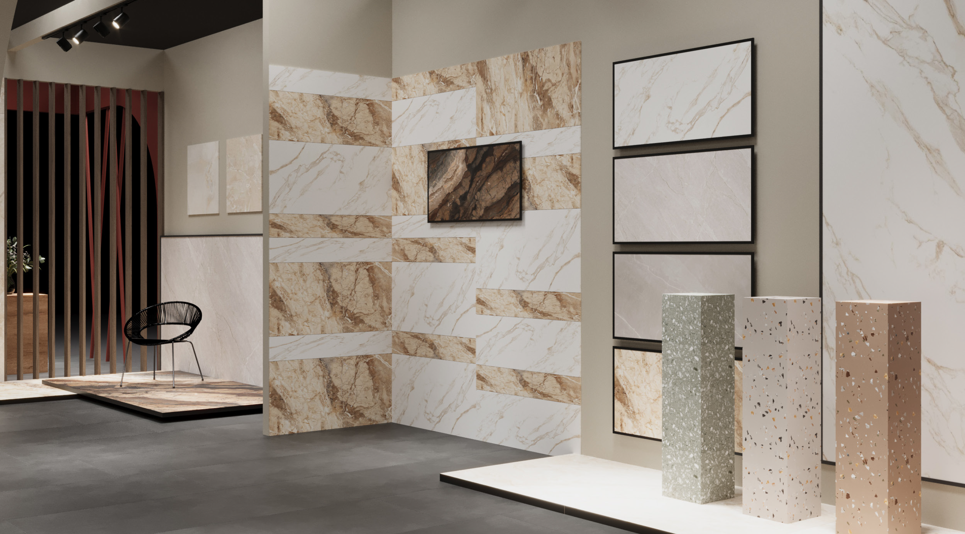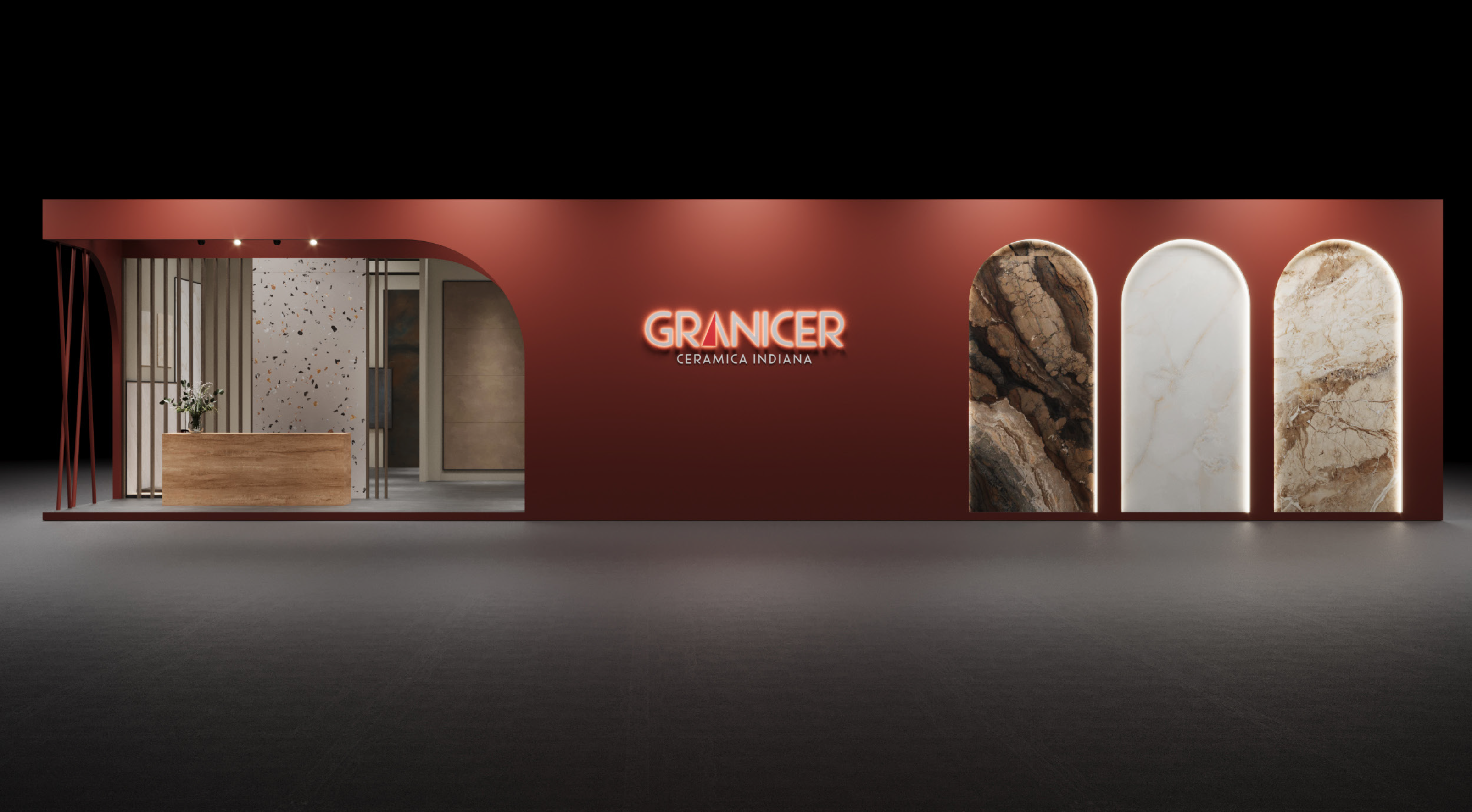 Un stand llamativo y elegante en el que la cerámica es el elemento más destacado. Sus líneas de producto incluyen baldosas para suelos, paredes y espacios exteriores, así como colecciones especiales para uso comercial e industrial.