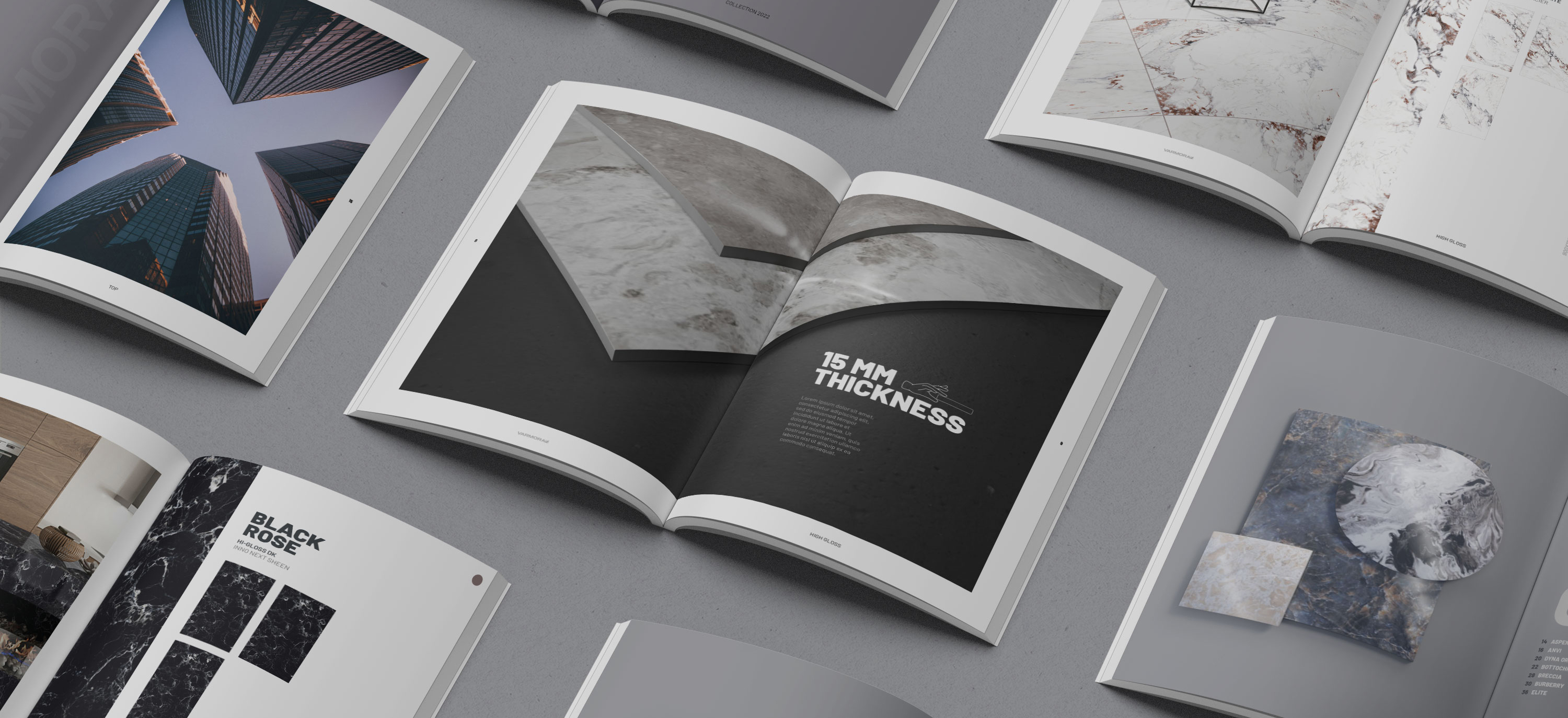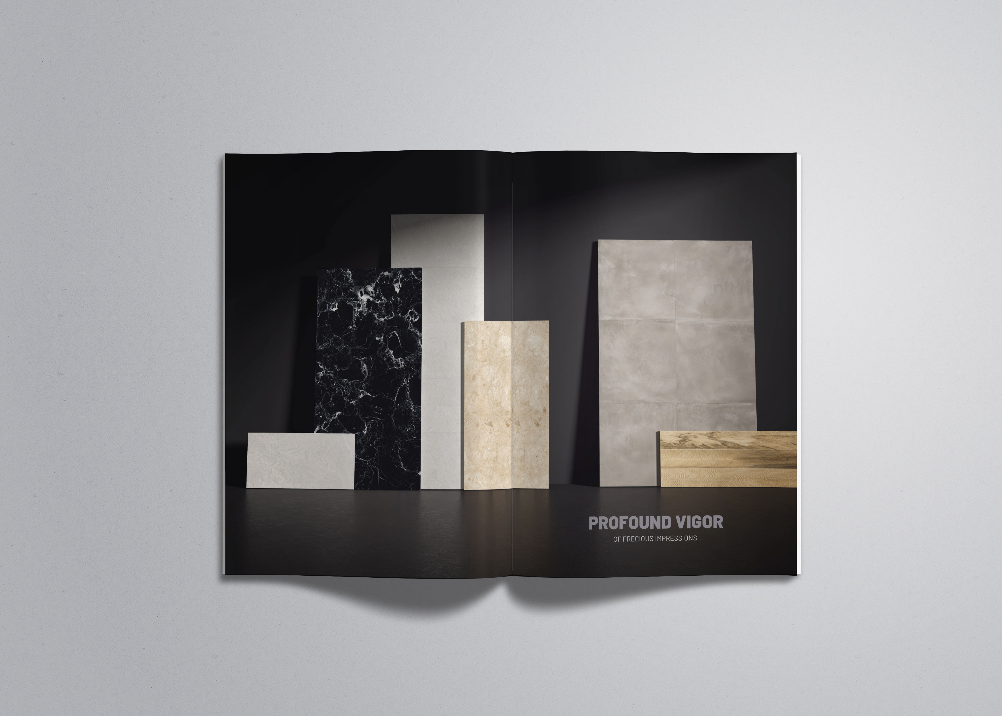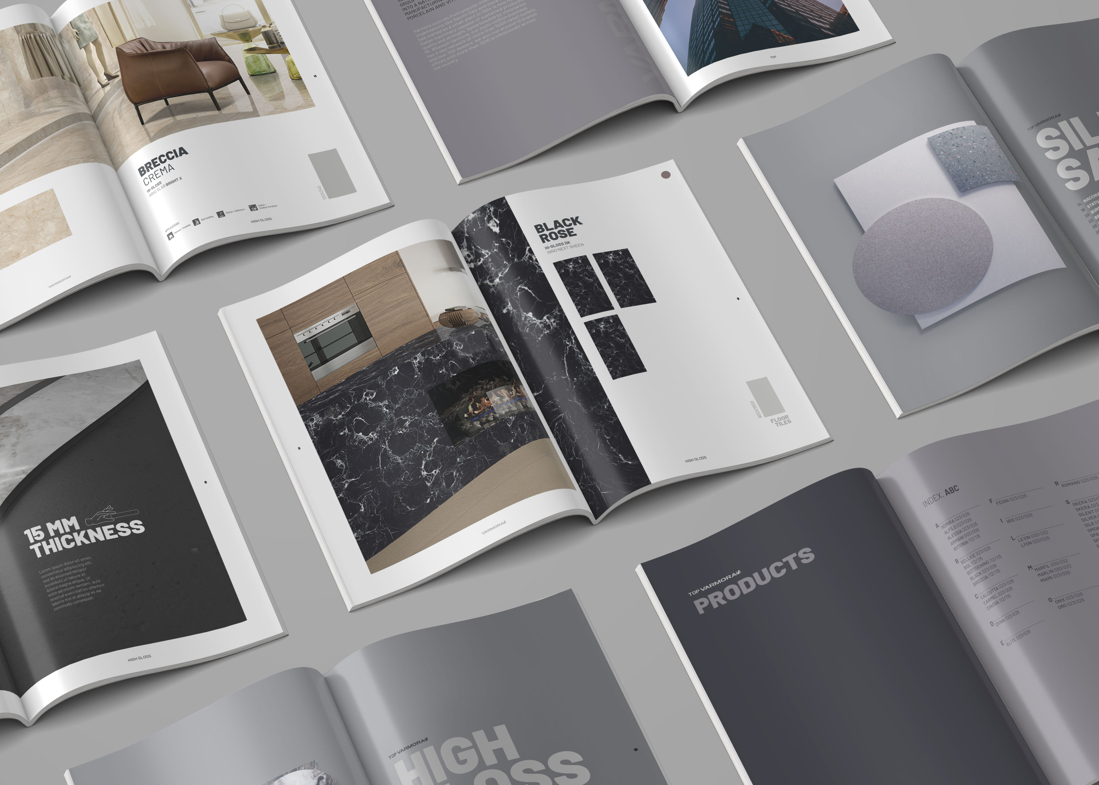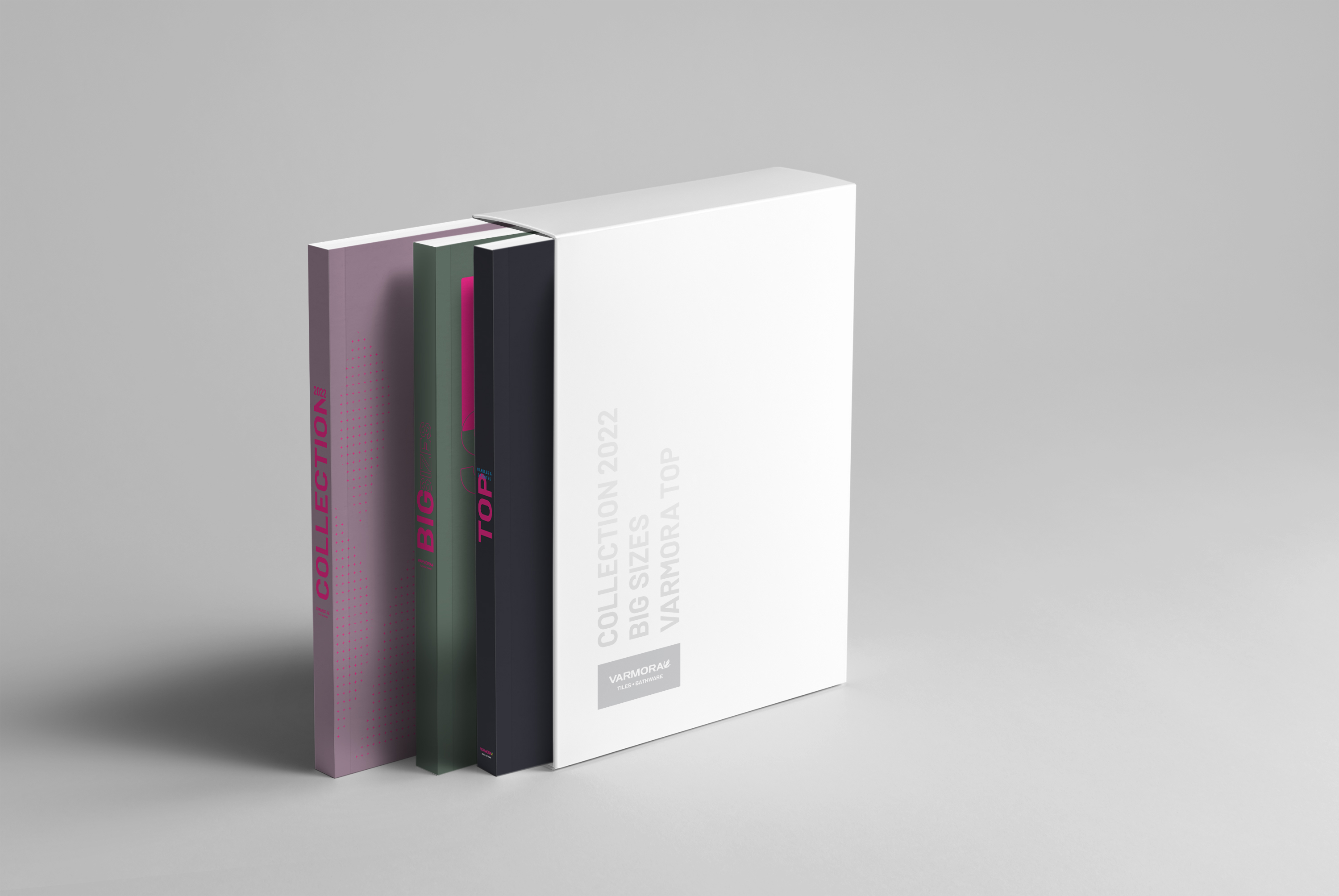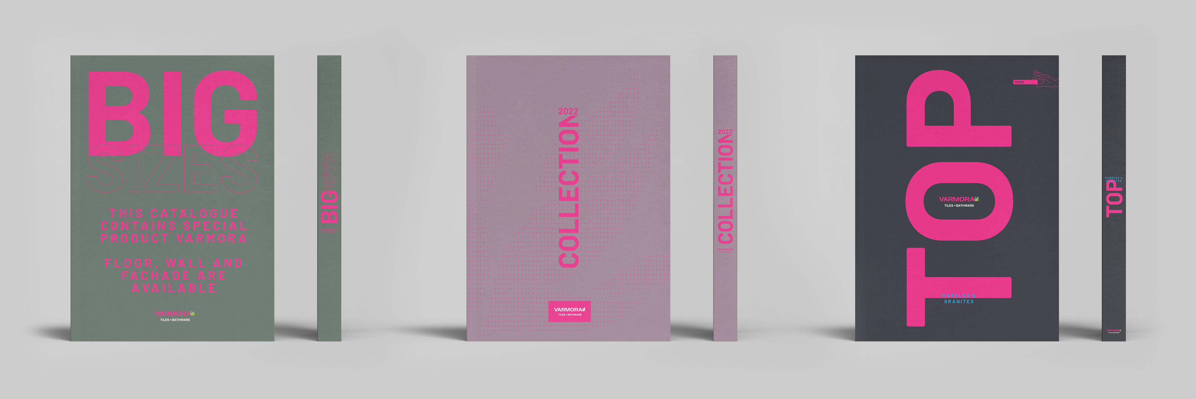 We designed 3 catalogues to show the product range of Varmora: Collection 2022, with Varmora ceramics for floors and walls. Big Sizes, with special bigsize products for floors, walls and facades, and Varmora TOP, with special products for applications of natural marble or granite.